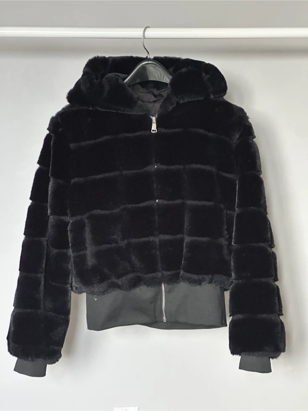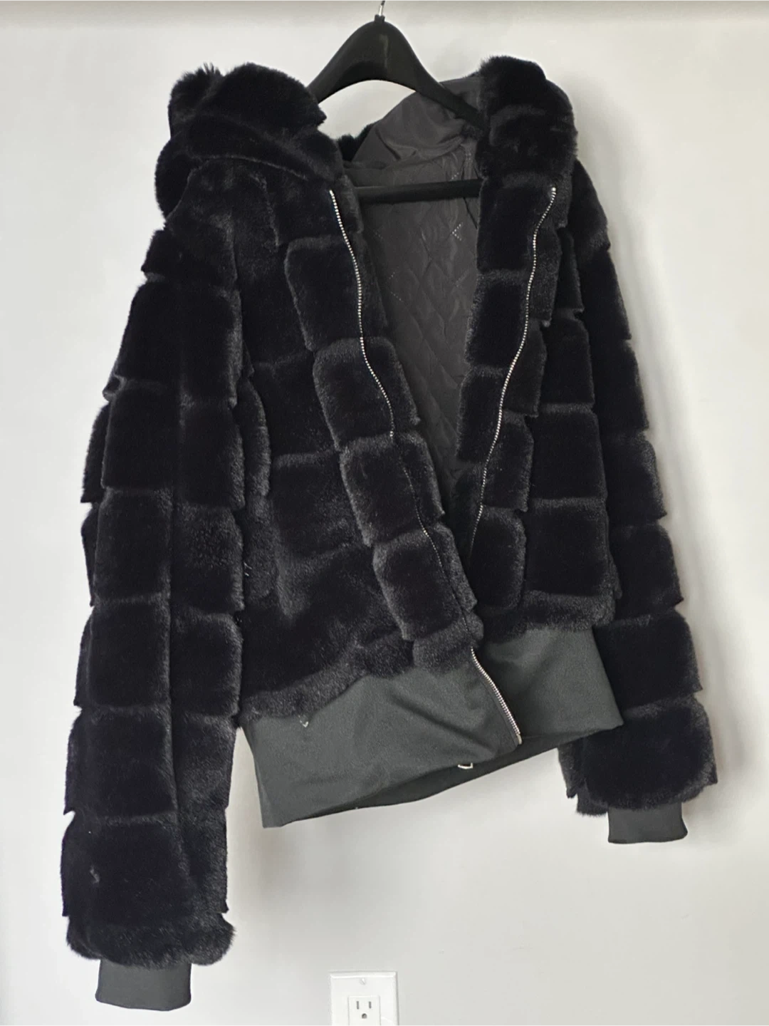 Selling a cozy ladies black faux fur hooded jacket. It's in great condition and insulated for winter.