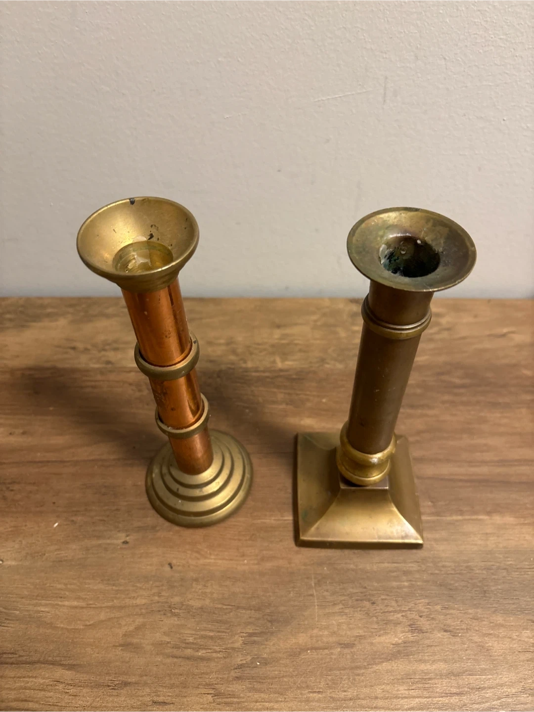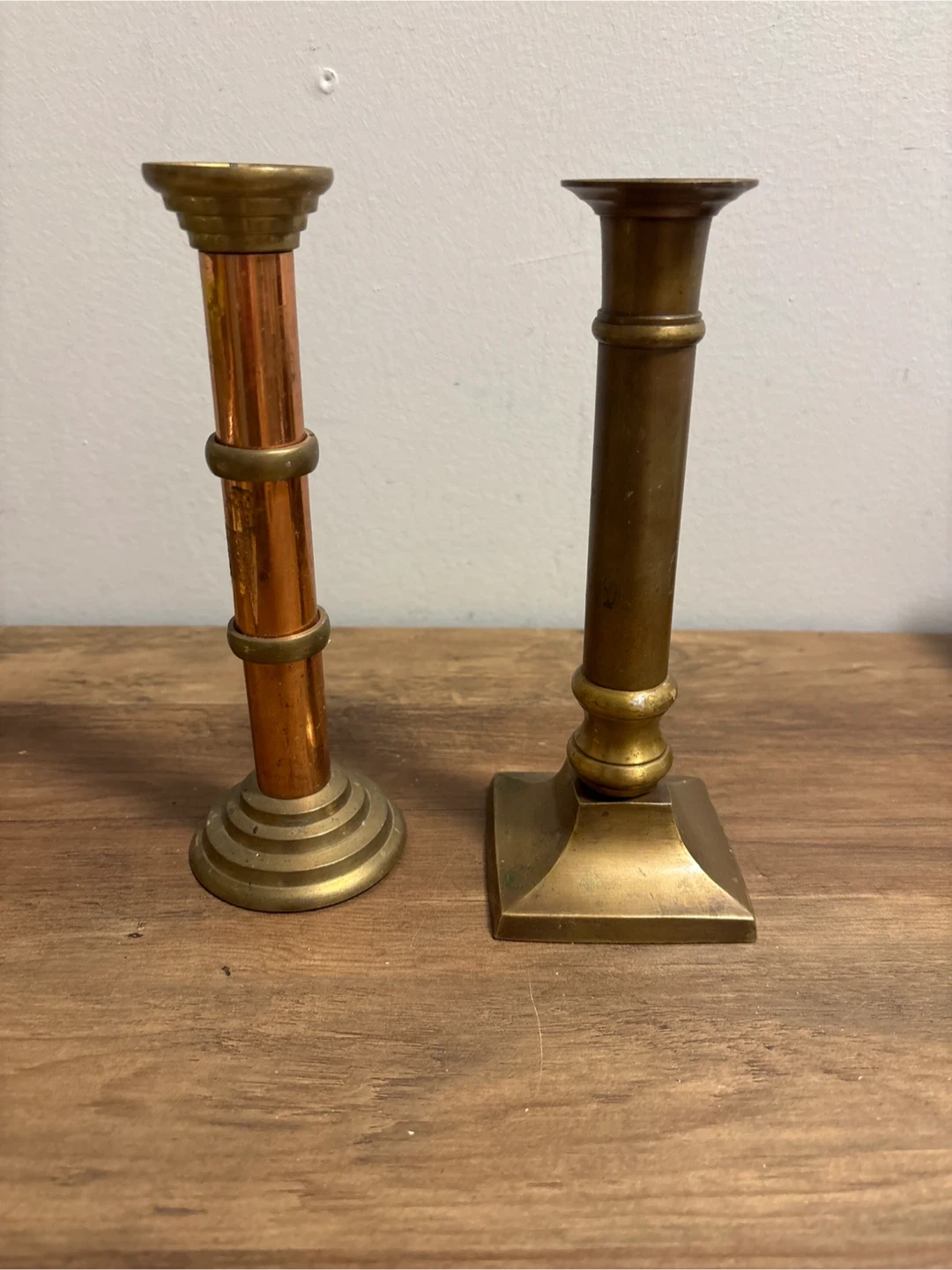 two vintage brass candlestick holders. They have a lovely patina and unique designs. Perfect for adding a touch of vintage charm to your home!