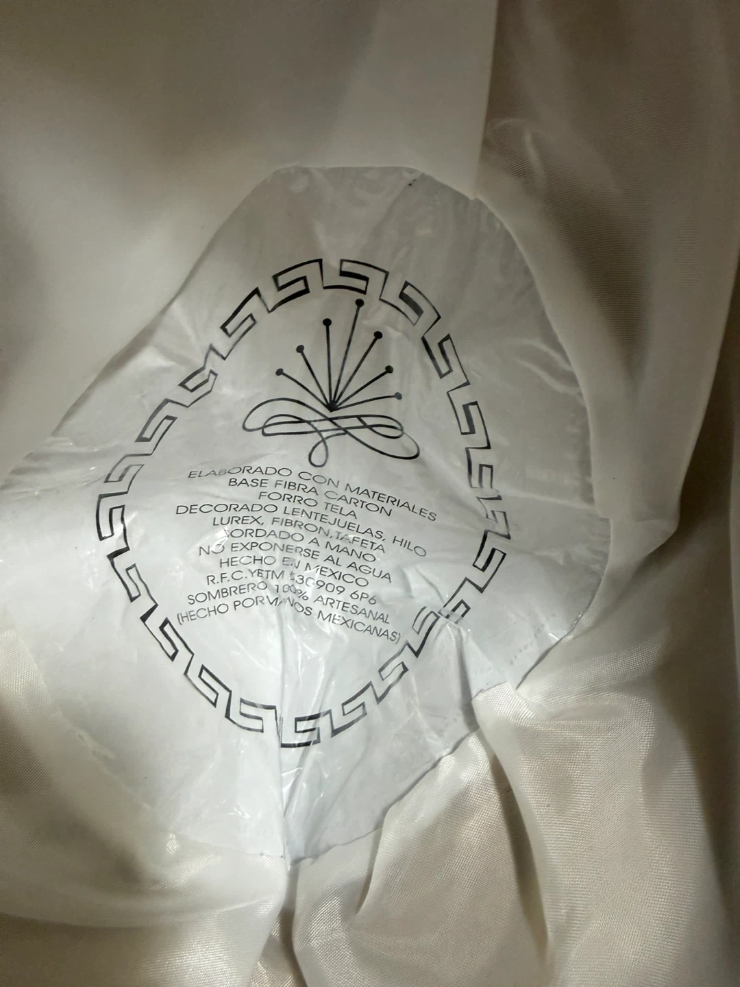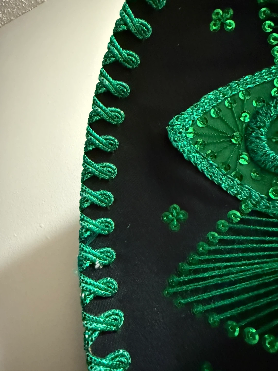 This is an authentic Mariachi charro sombrero, a traditional Mexican hat made with velvet fabric and embroidered with the colors of the Mexican flag.