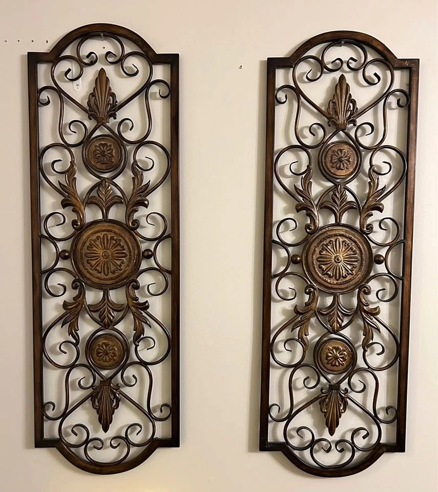 This stunning, large set of matching metal wall grilles! Featuring classic scrollwork and decorative medallions, distressed bronze/brown finish with copper or gold accents on the central medallions and scroll details, giving them an antique look. Bringing a touch of old-world elegance and drama to any room.