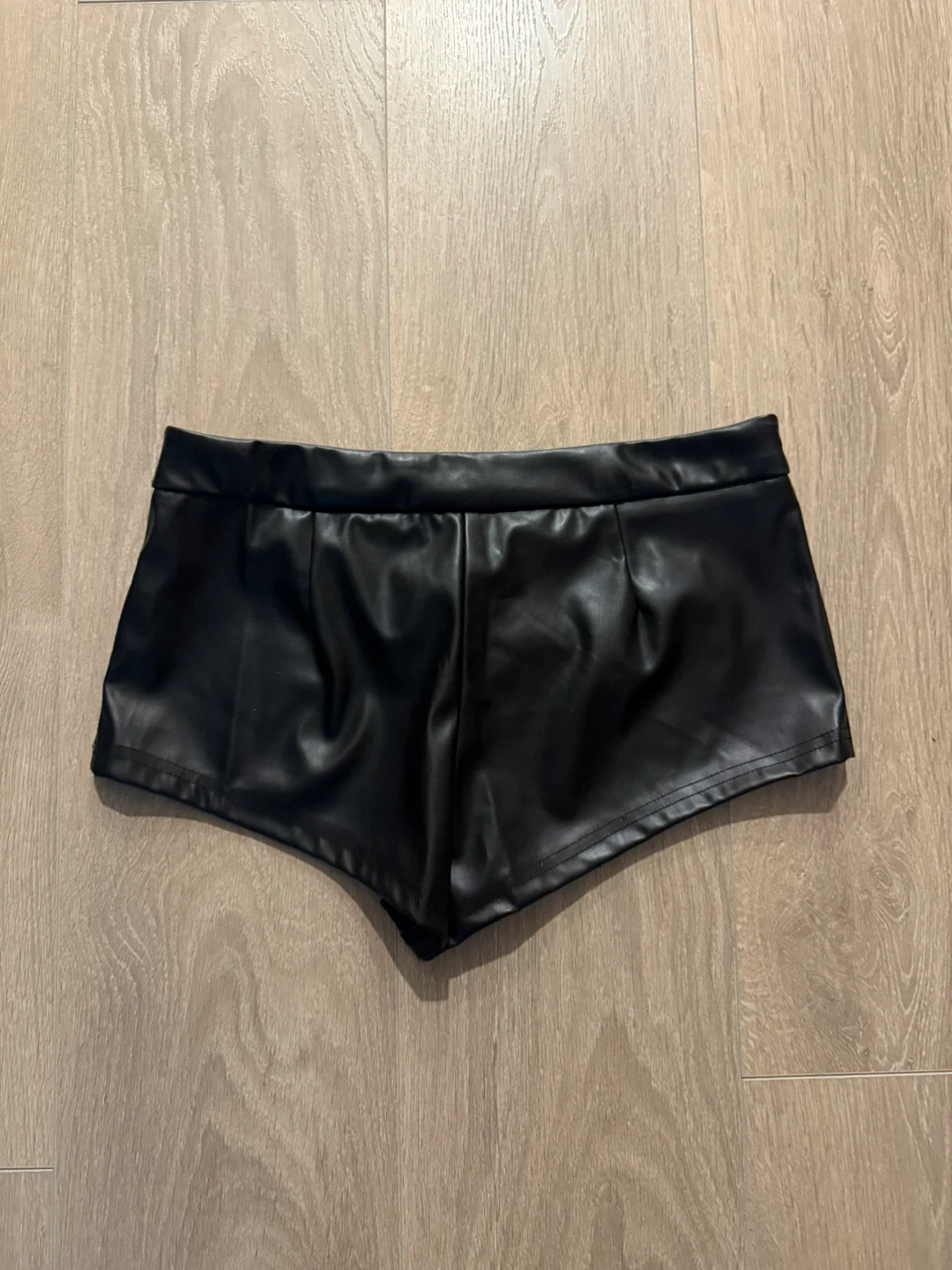 These black faux leather shorts are a stylish addition to any wardrobe! They're in great condition and ready for a new owner. Perfect for a night out or a trendy casual look. Never worn don’t remember the brand. Its XS/S but would fit a S better im a XS its big for me.