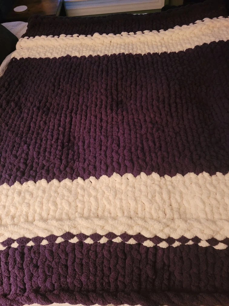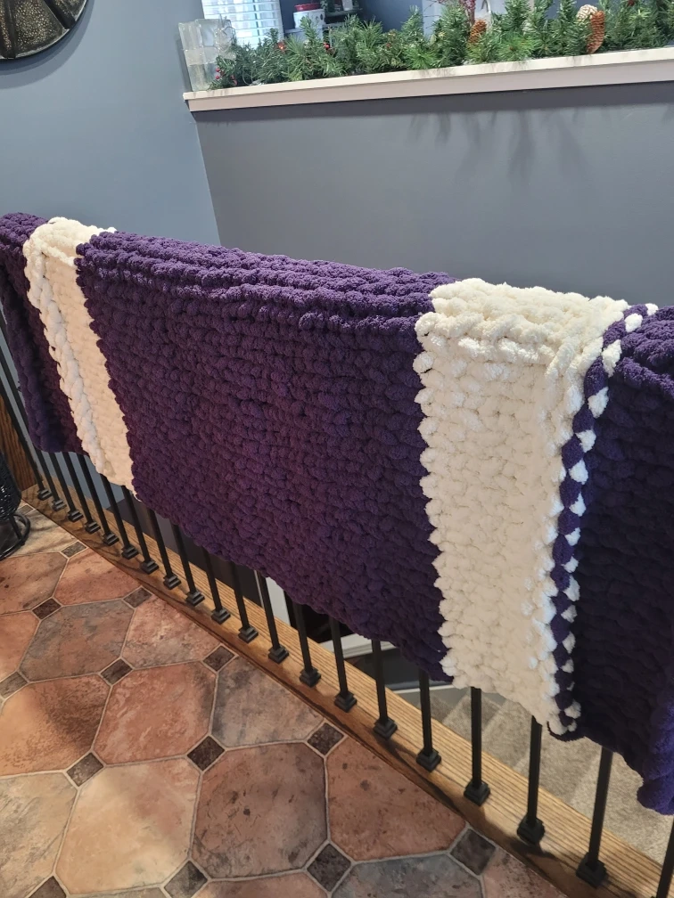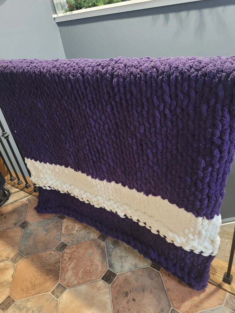Selling a super soft and cozy chunky knit blanket in purple and white. Perfect Christmas gift for your favourite Western student! Located in White Oaks