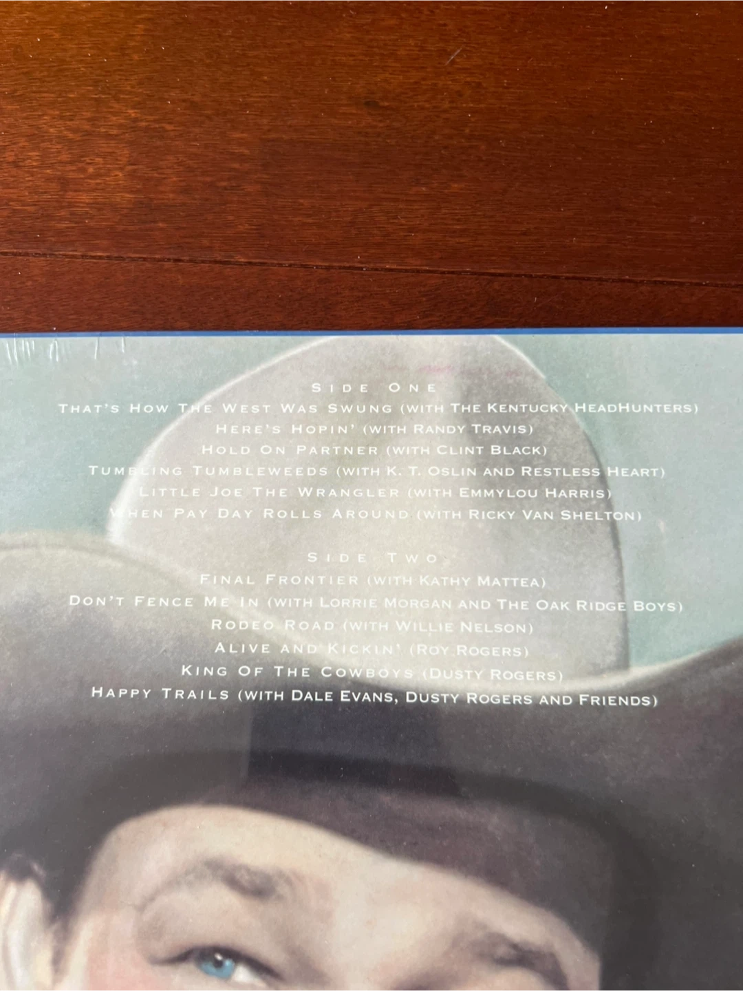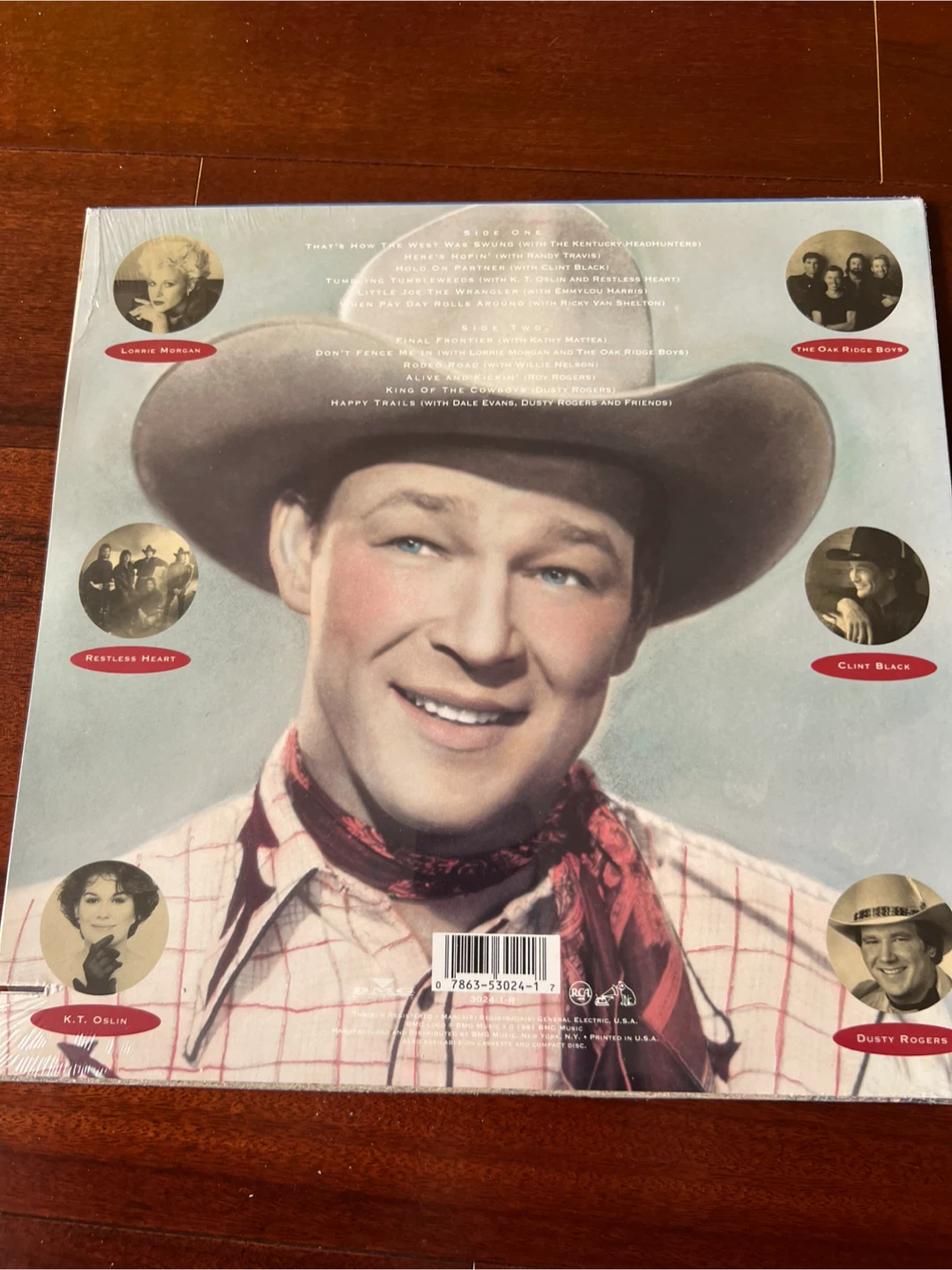 Selling a Roy Rogers Tribute vinyl record. It features collaborations with various artists such as Willie Nelson, Lorrie Morgan, and the Oak Ridge Boys. Side One includes songs like 'That's How the West Was Swung' and 'Here's Hopin',' while Side Two features 'Final Frontier' and 'Rodeo Road'.