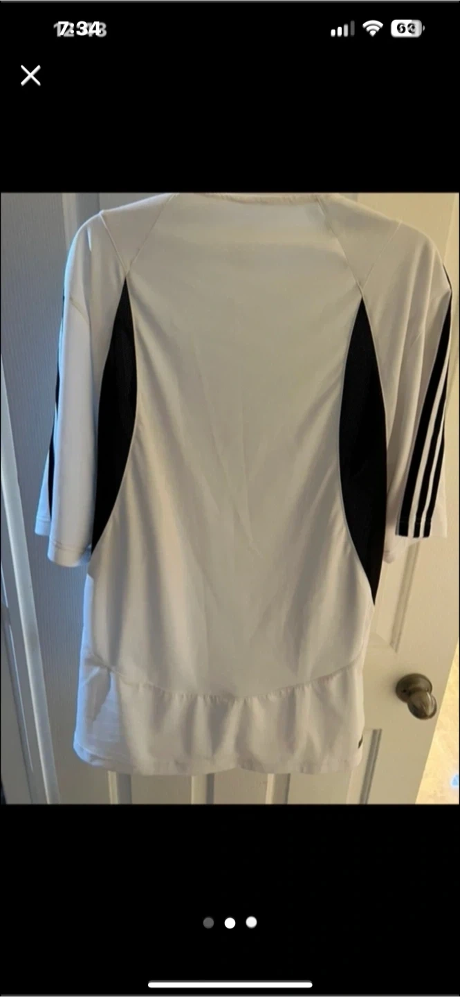 Here's an Adidas T-shirt in white with black accents. It has the Adidas logo on the front and the signature three stripes on the sleeves. It also features ATS COOL technology.