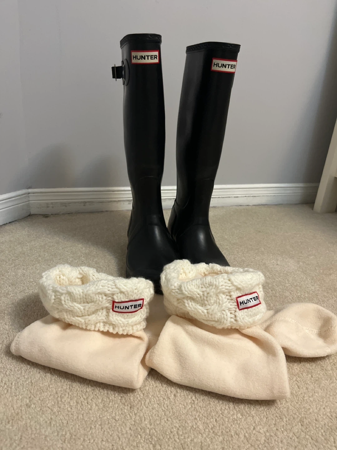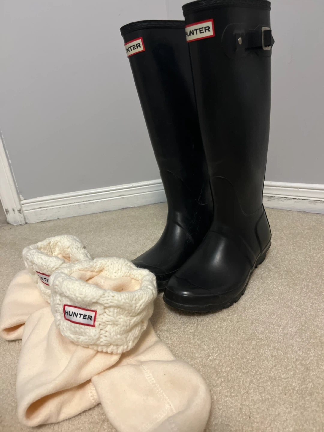 Selling a pair of Hunter rain boots, size 6/7. They've been used, but still have lots of life left! Also included are some Hunter socks and boot liners to keep your feet warm and cozy during those rainy days.