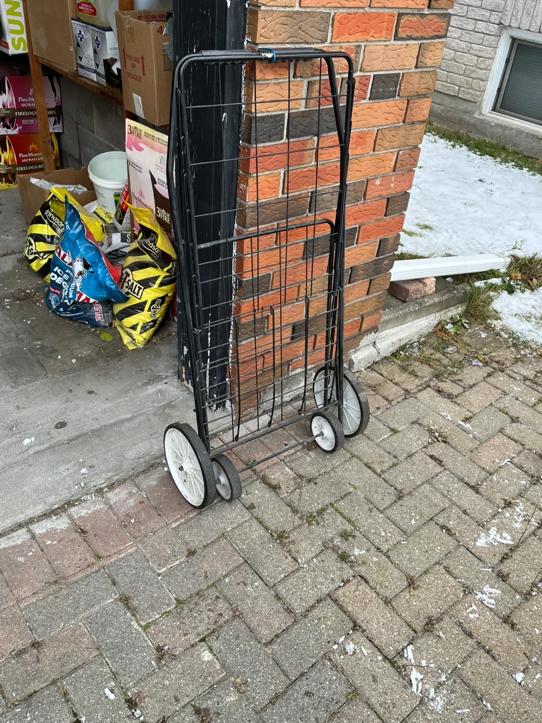 Selling a used folding shopping cart. It's in good condition and ready to help with your grocery runs or trips to the market! The cart is black and has white wheels.