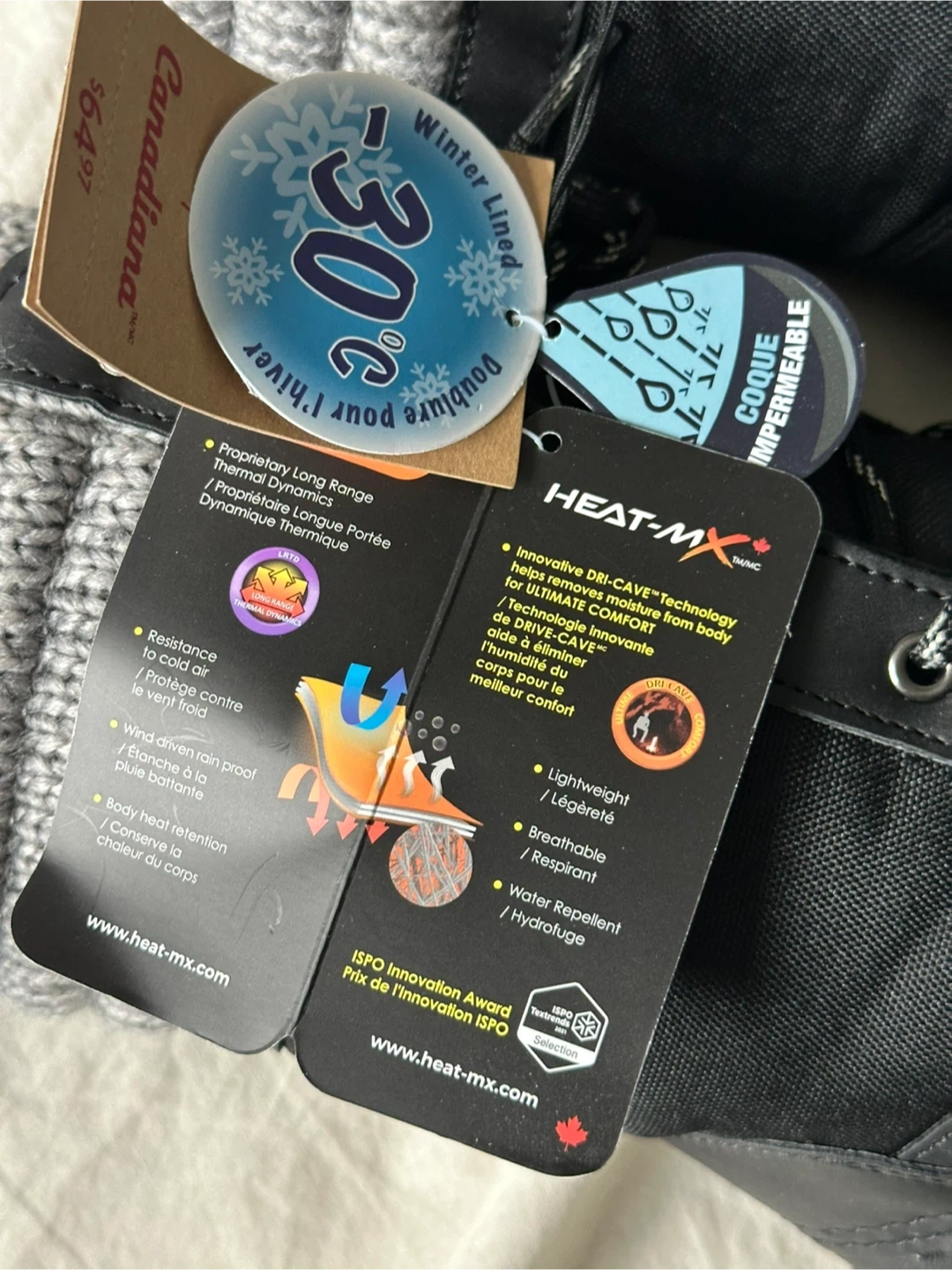 These Heat-MX winter boots are brand new never used. Get ready for the snowy season! They're black and feature a waterproof sole. Perfect for keeping your feet warm and dry this winter season