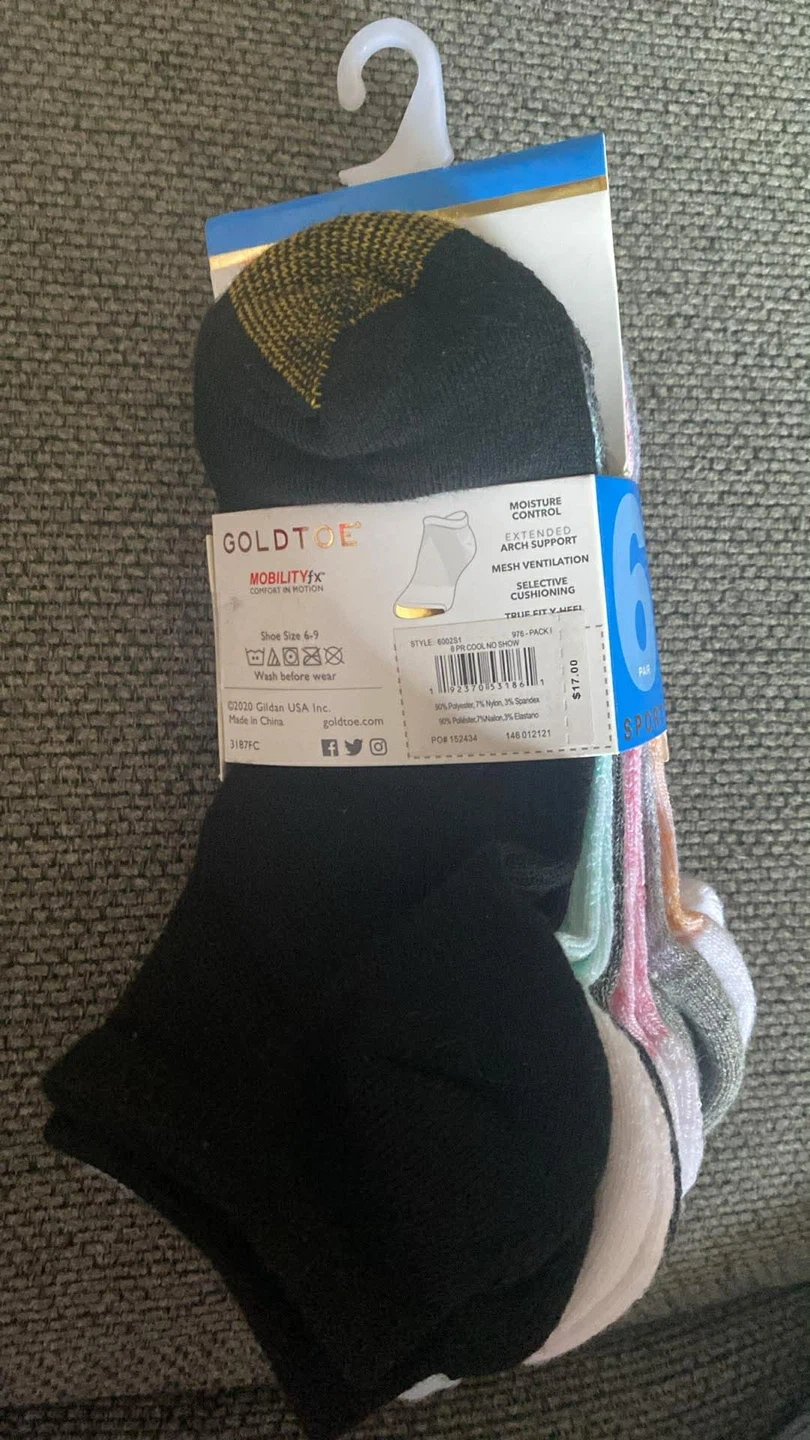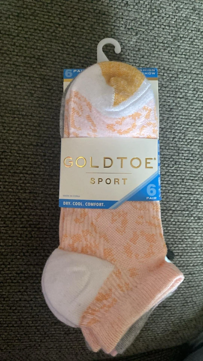 Here's a pack of GOLDTOE Sport socks, still in the original packaging! The pack includes 6 pairs of socks in assorted colours. They are size 4-10 and are made for dry, cool comfort. Originally bought for $17.00