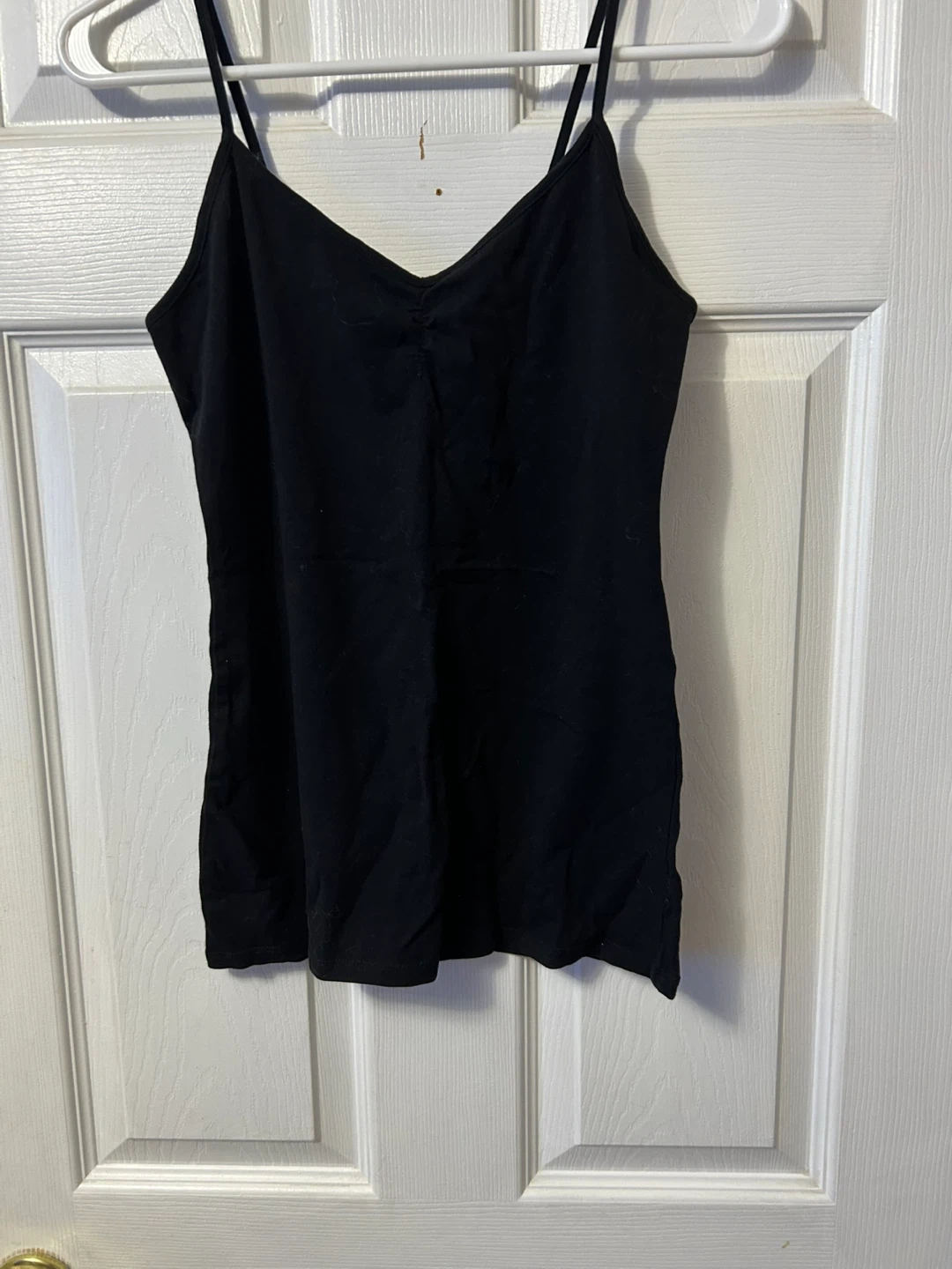 Here's a simple black camisole tank top! It's in great condition and would be a nice addition to your wardrobe. It's a versatile piece that can be dressed up or down