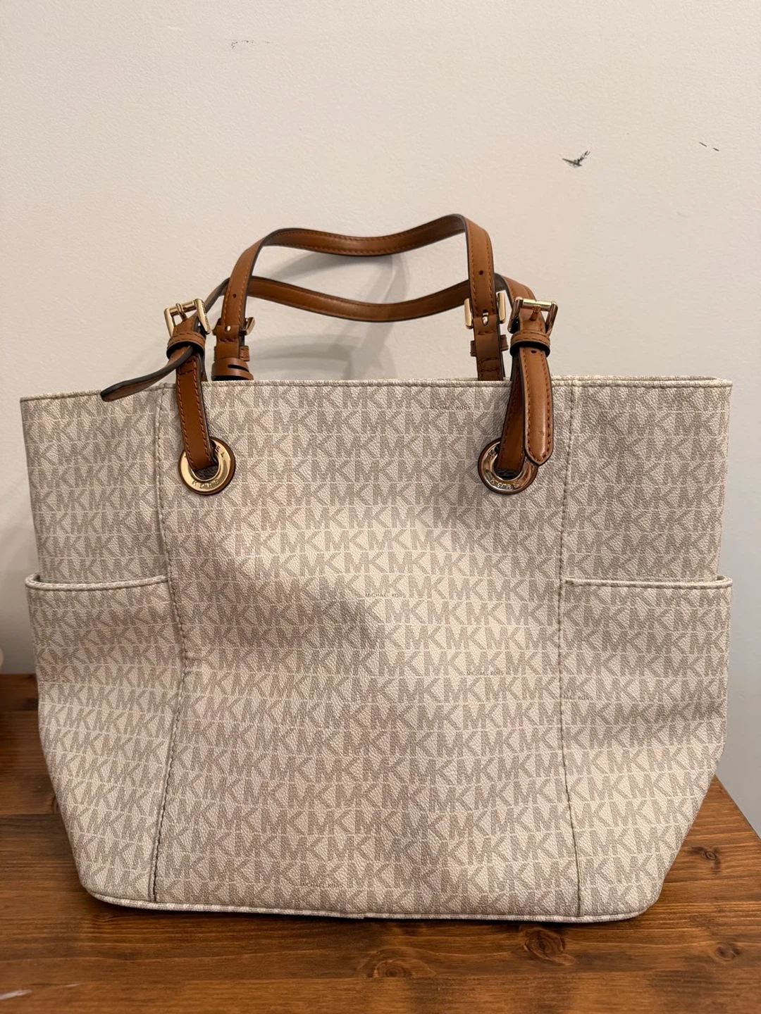 This is a Michael Kors tote bag with the MK logo pattern all over. It has brown handles and gold hardware. Perfect for everyday use!