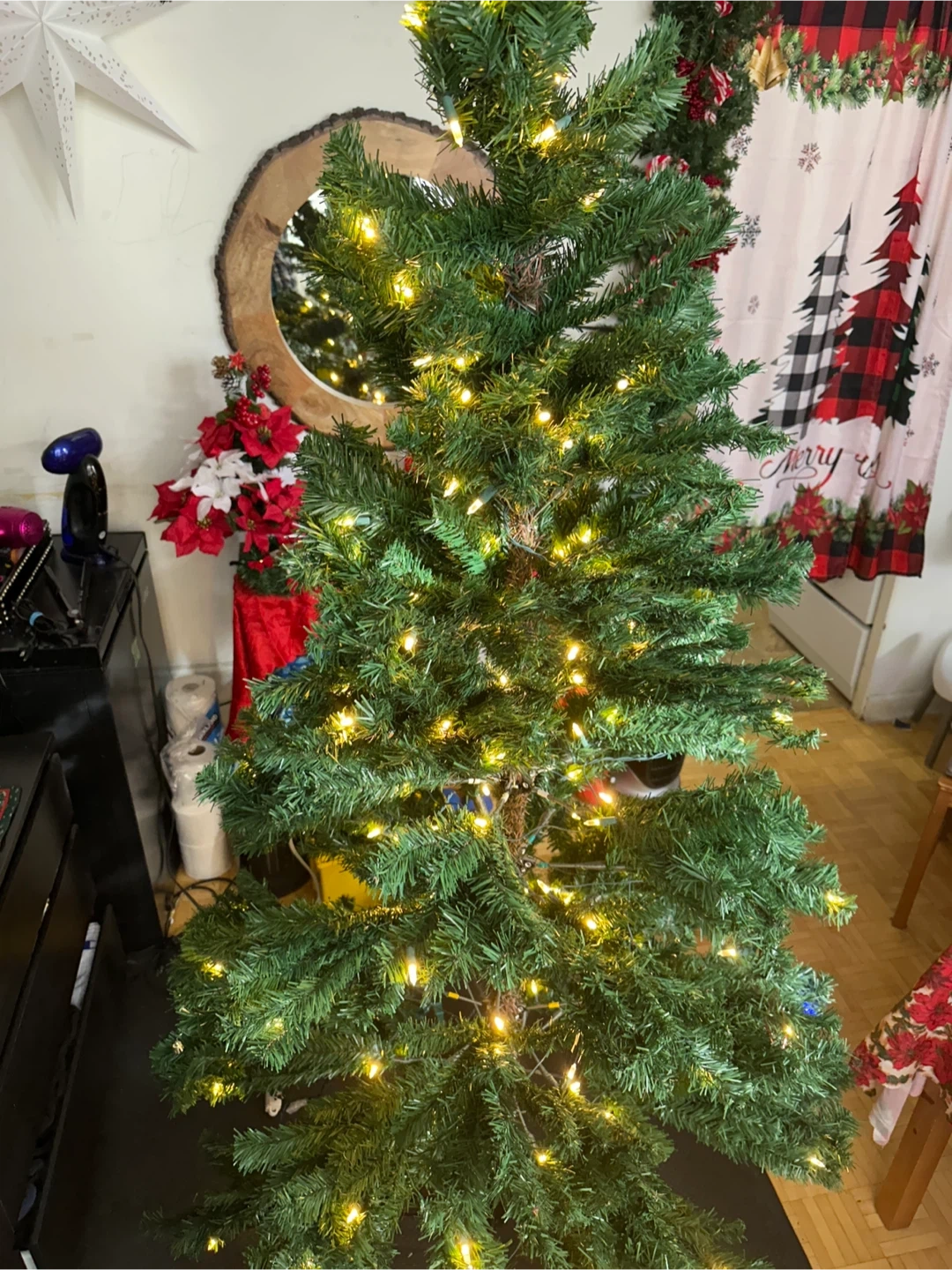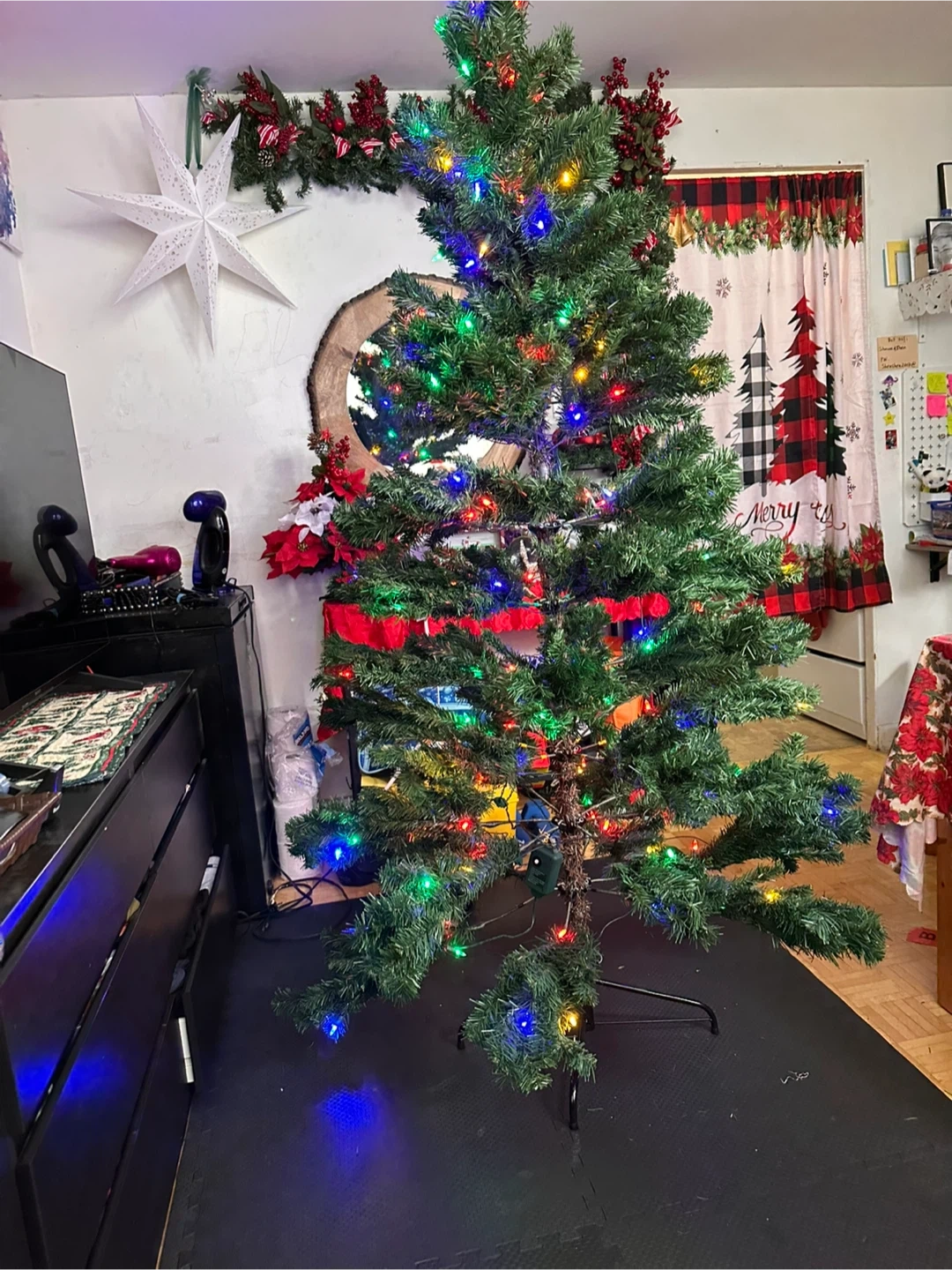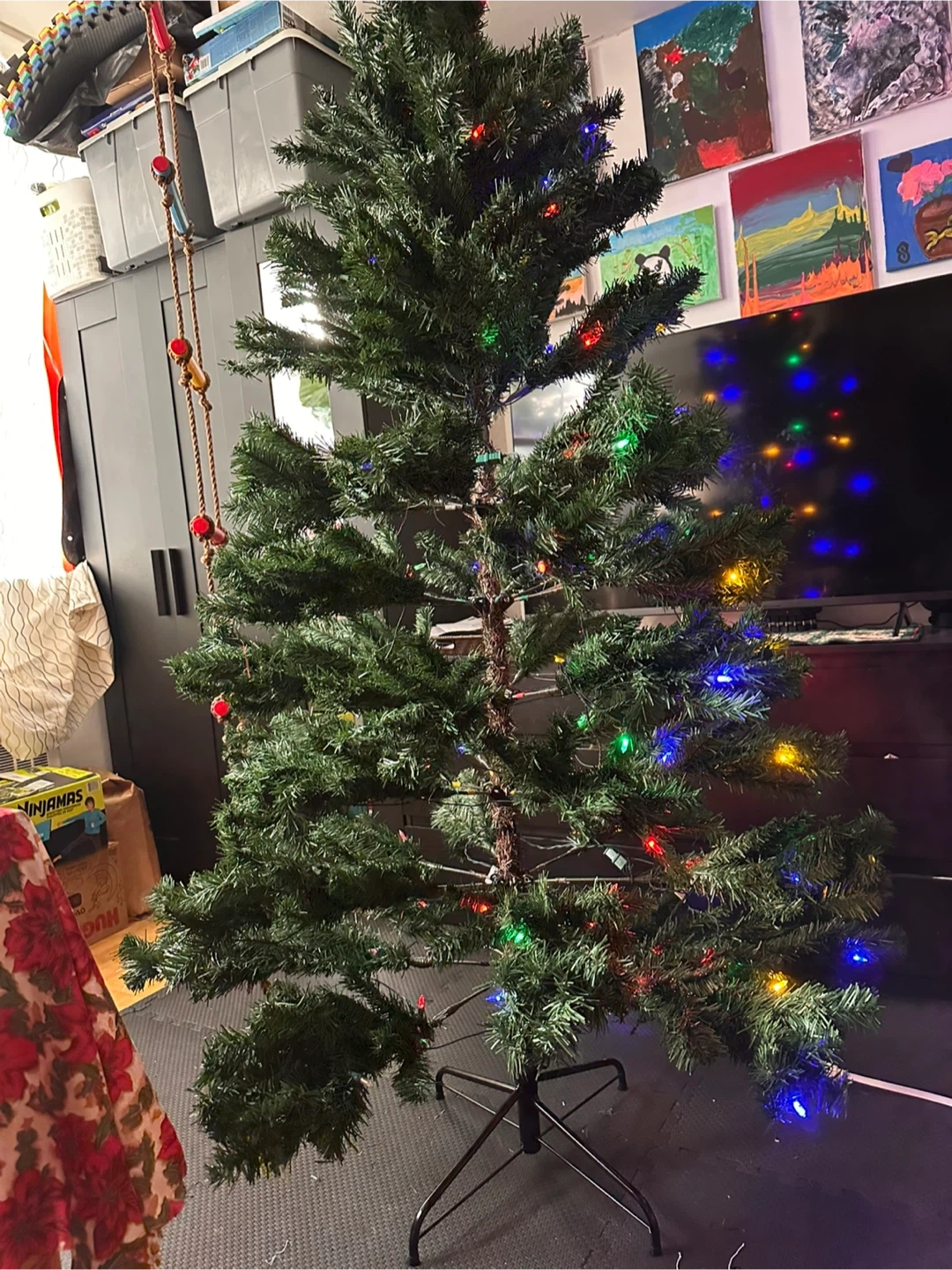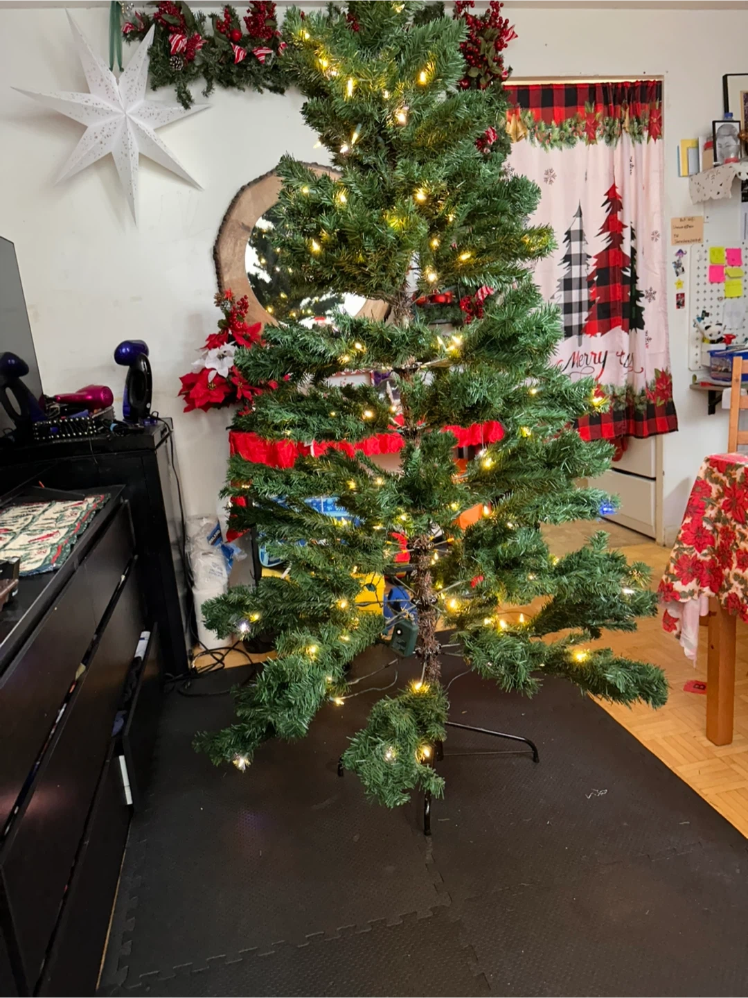 FREE!!! PICK UP ASAP! a pre-lit artificial Christmas tree. It's in great condition and ready to bring some holiday cheer to your home!From a Smoke-free, Pet-free home! We're just downsizing so we have to give this away for FREE! No issues on lights or the tree itself.