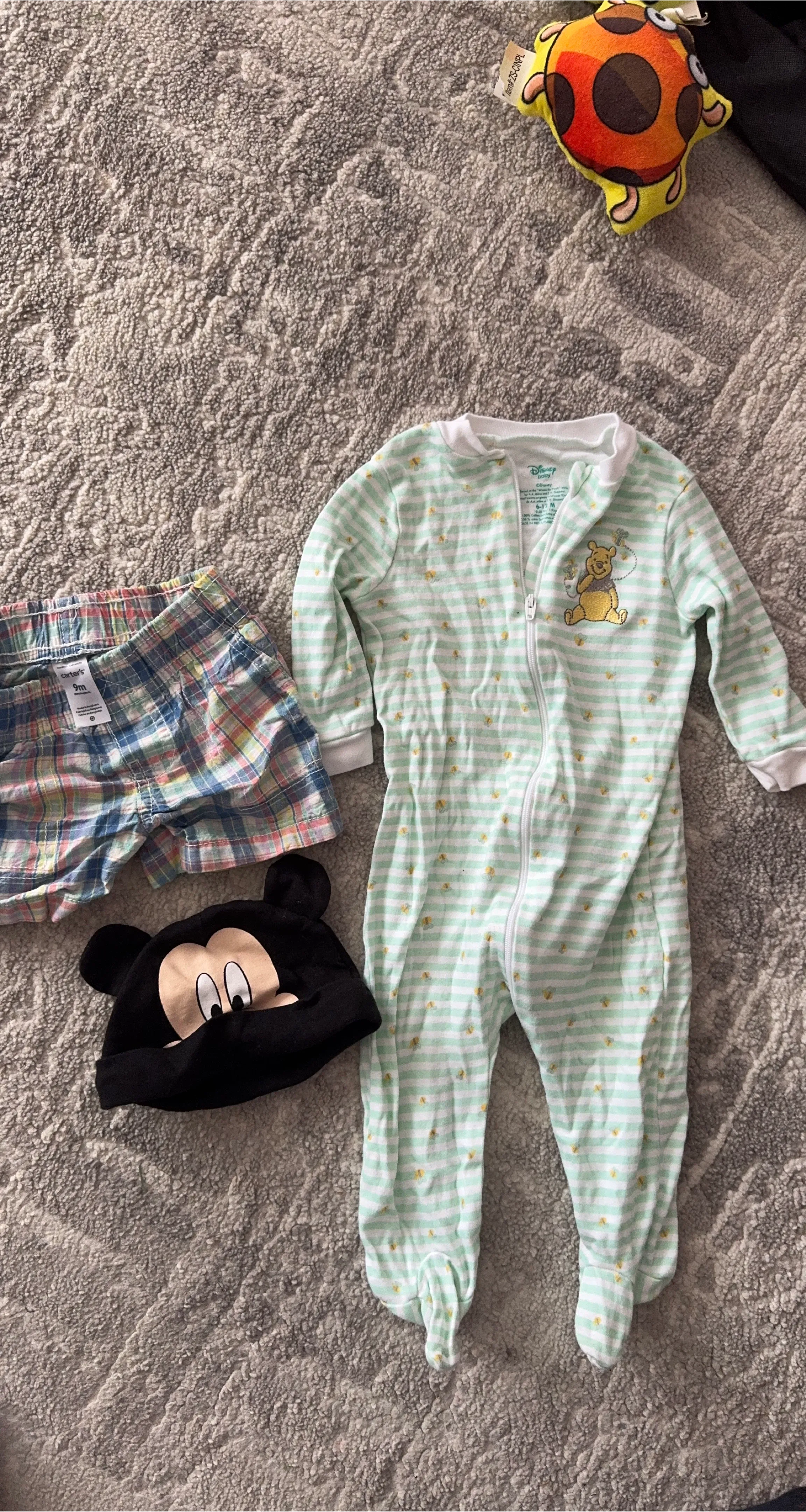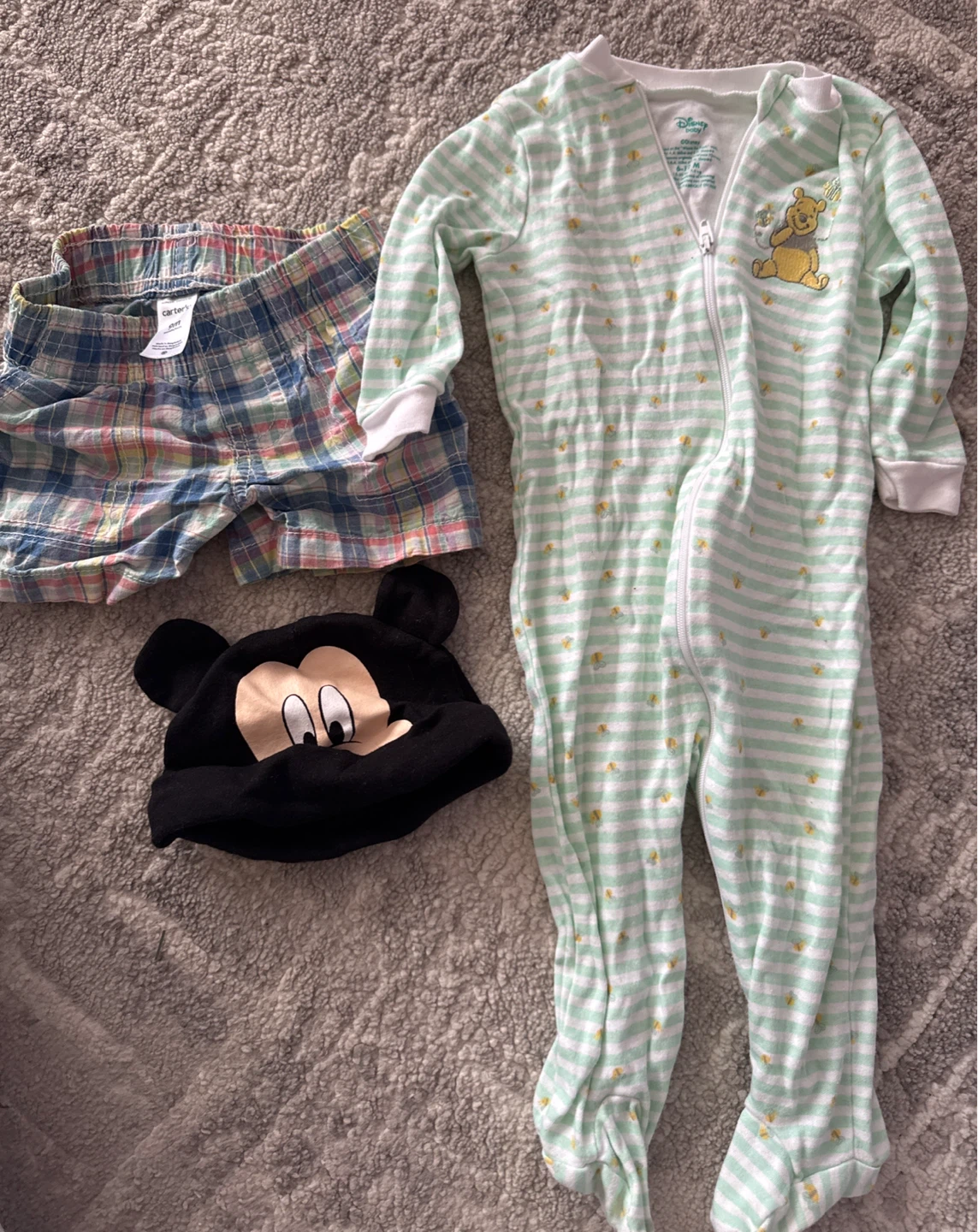 Selling a cute Disney baby bundle! Includes a Winnie the Pooh striped sleep-suit 6-12M Mickey & Mouse hat 9M. Also Carter’s shorts 9M. Perfect for your little one!
