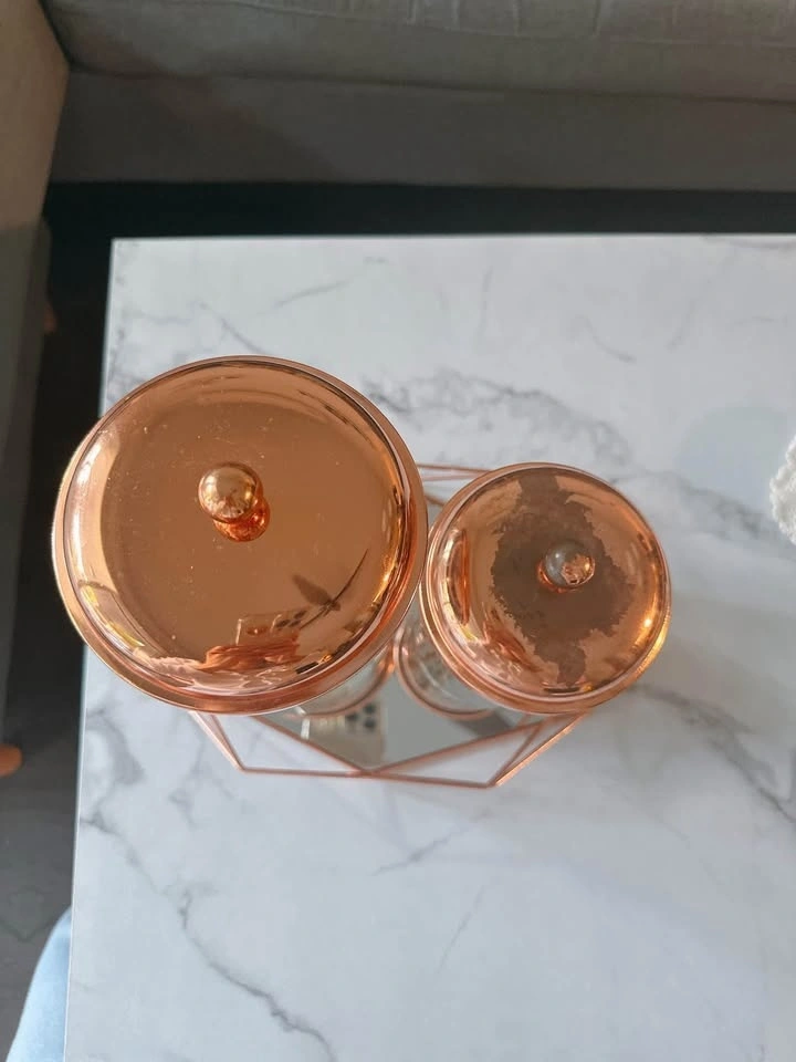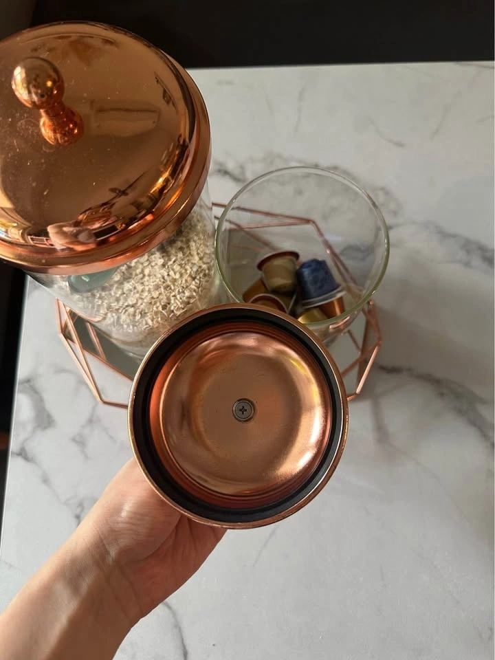 Priced as set for all 3! Contents in jars for display purposes only; they are all washed and cleaned out ^^ Smaller jar with nespresso pods has the colour worn off but can be repaired; Larger jar is fine. I displayed them with a matching rose gold mirror tray that can be used seperately for holding jewelry or other trinkets~