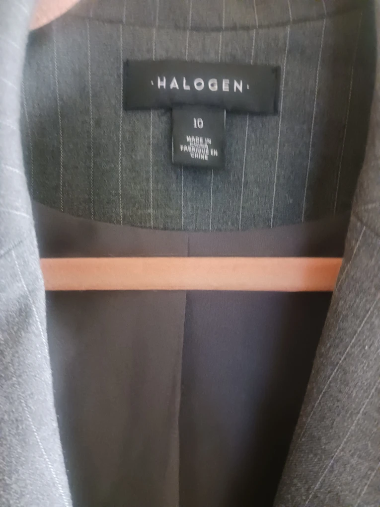 Selling a Halogen blazer in a stylish gray pinstripe design. It's a size 10 and in great condition. Perfect for adding a professional touch to any outfit!