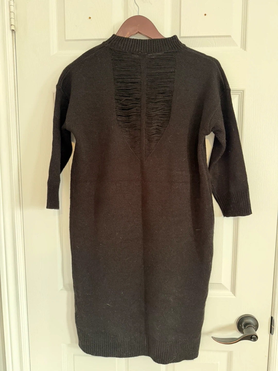 Selling a gently used black sweater dress in size S. It features a crew neck, 3/4 sleeves, and a unique ruched detail on the back. Perfect for a cozy and stylish look! Cute details in the back as well.
