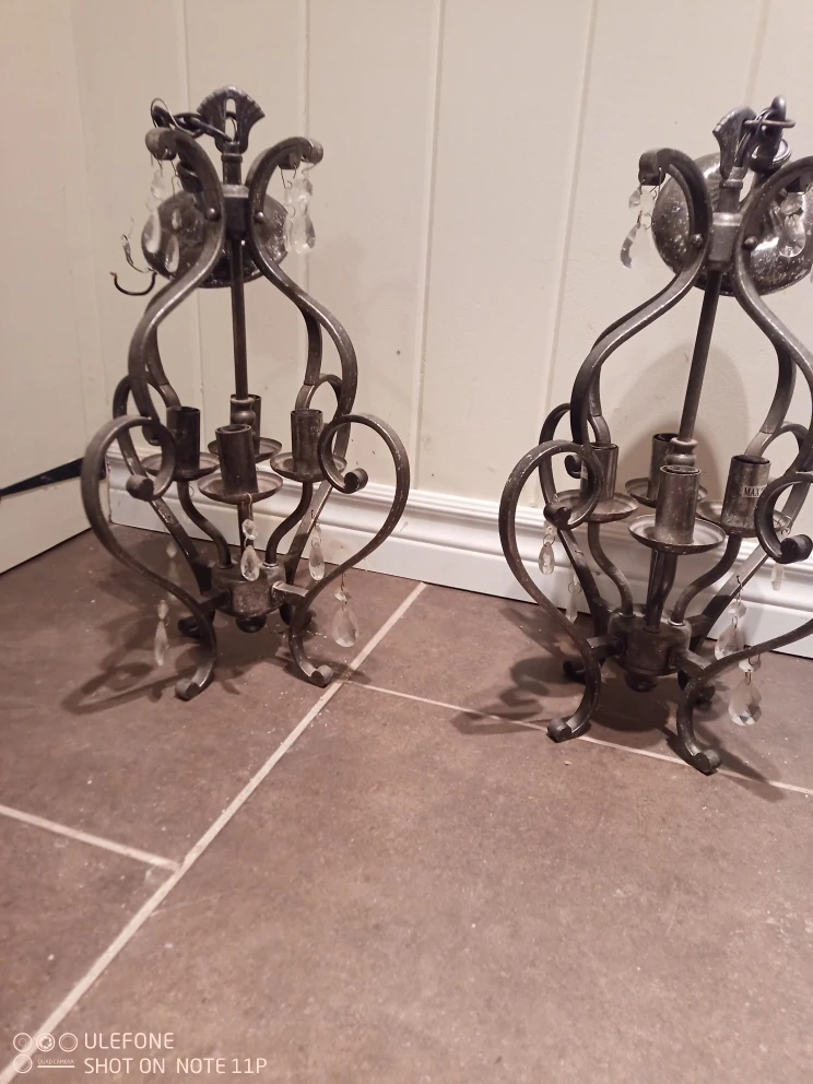 Selling a pair of ceiling metal rod iron light fixtures They have a rustic, wrought-iron look with decorative crystal accents. Perfect for adding a touch of vintage charm to your home decor!
