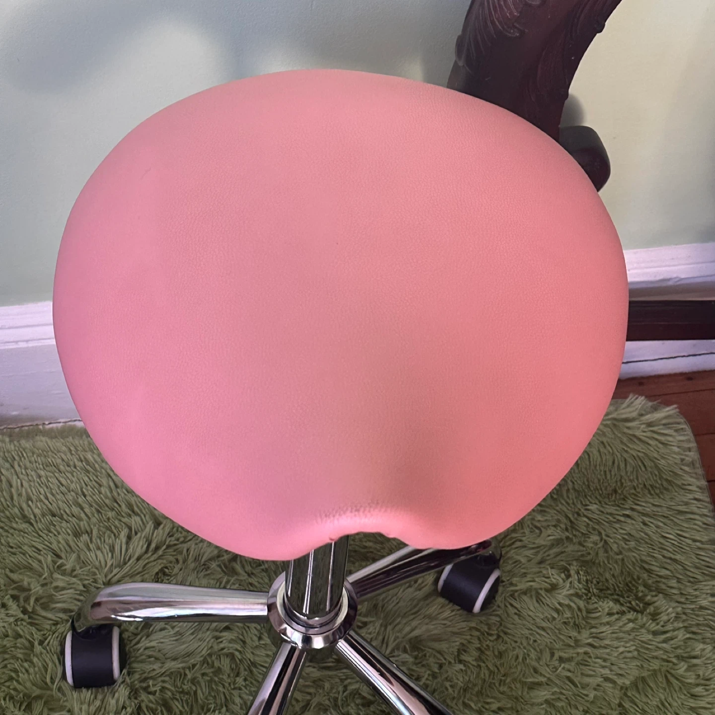 Selling a pink saddle stool chair! It's in good condition and ready for a new workspace or home office. The chrome base is sturdy and the wheels roll smoothly.