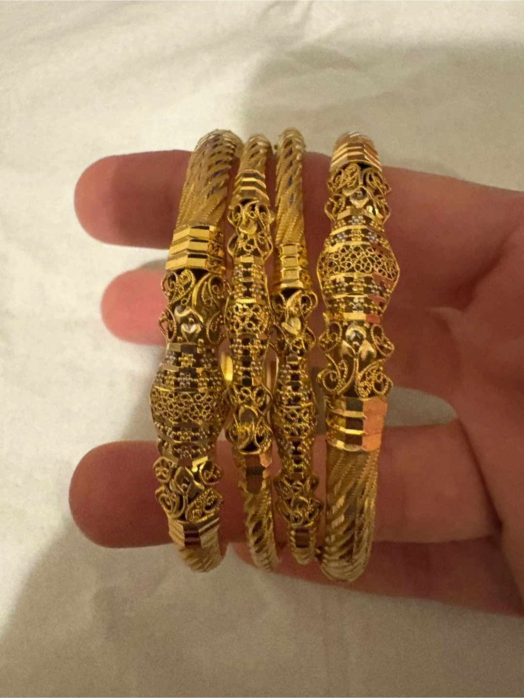 Selling a set of four beautiful gold bangles marked 975 KDM. They have intricate detailing and a lovely gold colour. They weigh approximately 45 grams together. Perfect for adding a touch of elegance to any outfit!