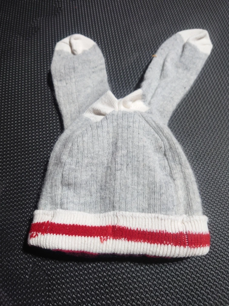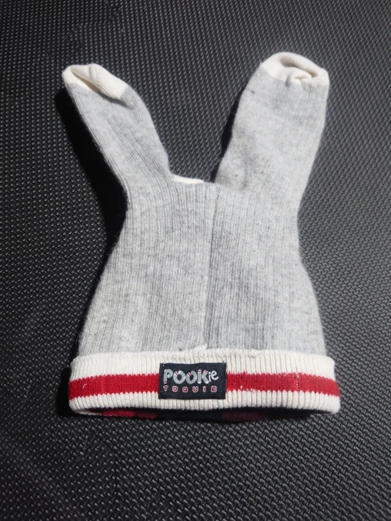 Selling a cute Pookie Toque bunny hat! It's grey with red and white stripes, and has a red and black plaid interior lining. Perfect for keeping your little one warm and stylish!