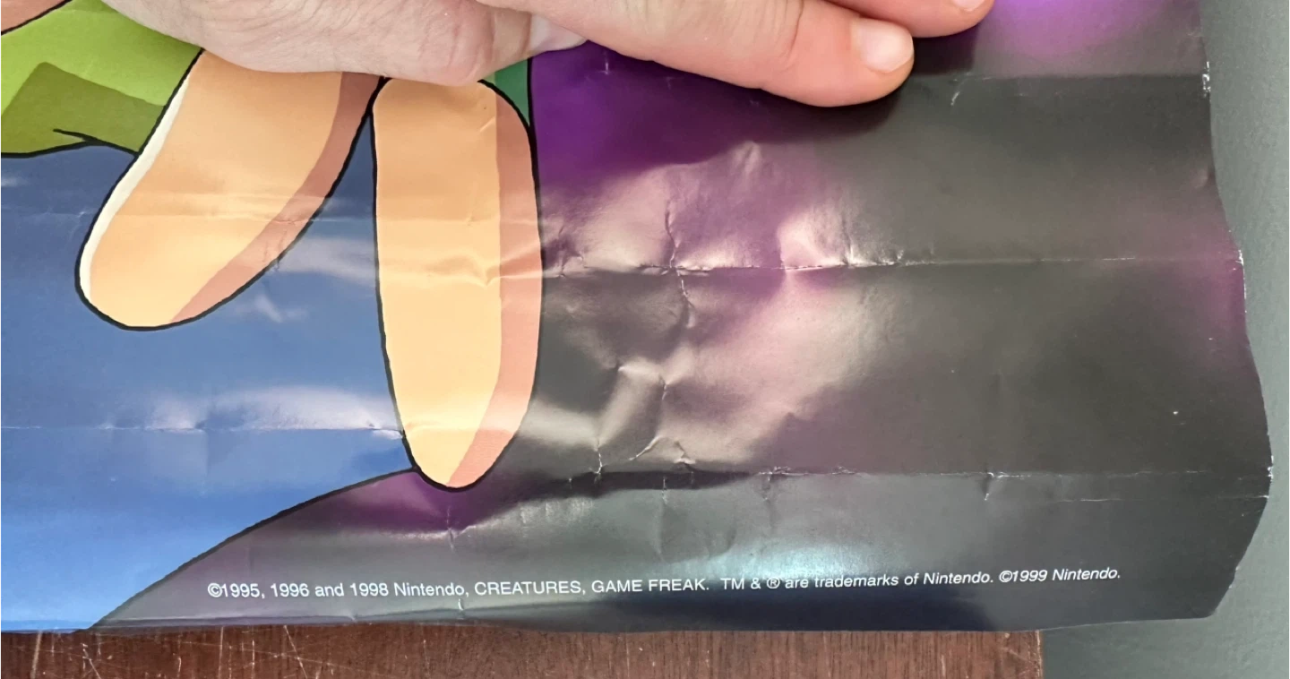 Selling a Pokémon "Gotta catch 'em all!" poster. It features Pikachu, Squirtle, Bulbasaur, and Charmander, along with Ash Ketchum. The poster has some wear and tear, as seen in the pictures. Copyright dates at the bottom indicate 1995, 1996, 1998, and 1999.