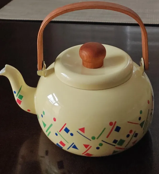 Selling a cute cream-coloured enamel teapot! It has a wooden handle and a fun geometric pattern in red, blue, and green. Perfect for tea time. Never used. Brand new.