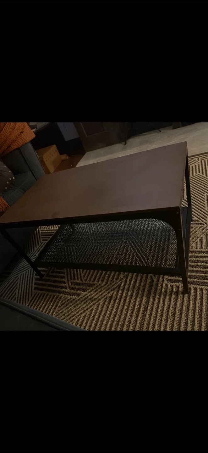 Selling a gently used coffee table with a brown top and a black metal frame. It features a handy metal mesh shelf underneath for extra storage or decor. Perfect for any living room!