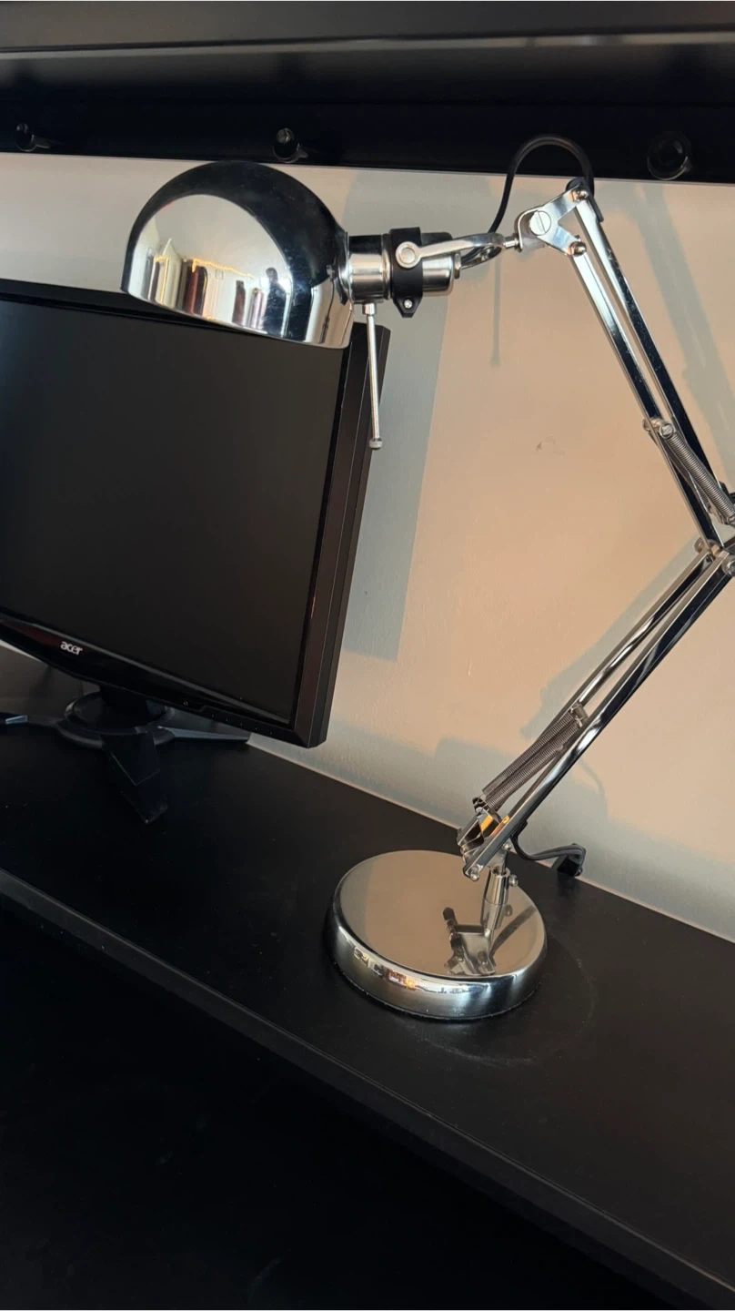 Sleek IKEA chrome desk lamp with adjustable arm and swivel head. Gives off a warm, cozy light and is perfect for a desk, bedside, or reading nook. In good used condition with minor surface wear only (rarely used, it’s just a bit dusty), switch and joints all work well. Bulb included so it’s ready to plug in and use. Pick up at UBC.