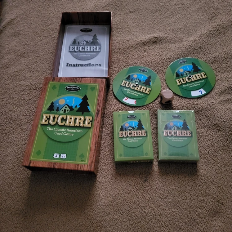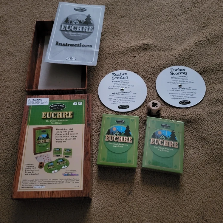 Selling a Front Porch Classics Euchre Card Game! It includes two decks of custom cards, unique scoring tokens, and instructions. The original trick-taking card game is perfect for ages 8 and up. The box is included!