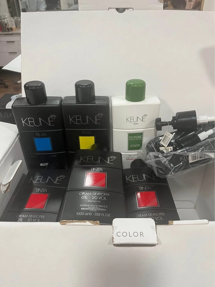 Complete Keune Intro Kit with 48 tubes of colour, matching developers, and back bar shampoo & conditioner.