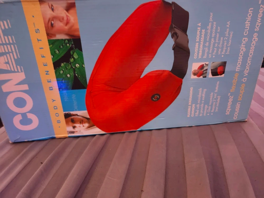 Selling a Conair Squeezz flexible massaging cushion. It's filled with microbeads to provide a soothing massage. This cushion is chair mountable and requires 2 'AA' batteries (not included). The box is included!
