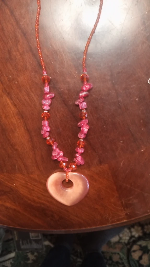 This is a charming pink beaded necklace featuring a heart-shaped pendant. The beads are a mix of pink and orange hues, adding a touch of warmth to the design. It's a lovely piece to accessorize any outfit!