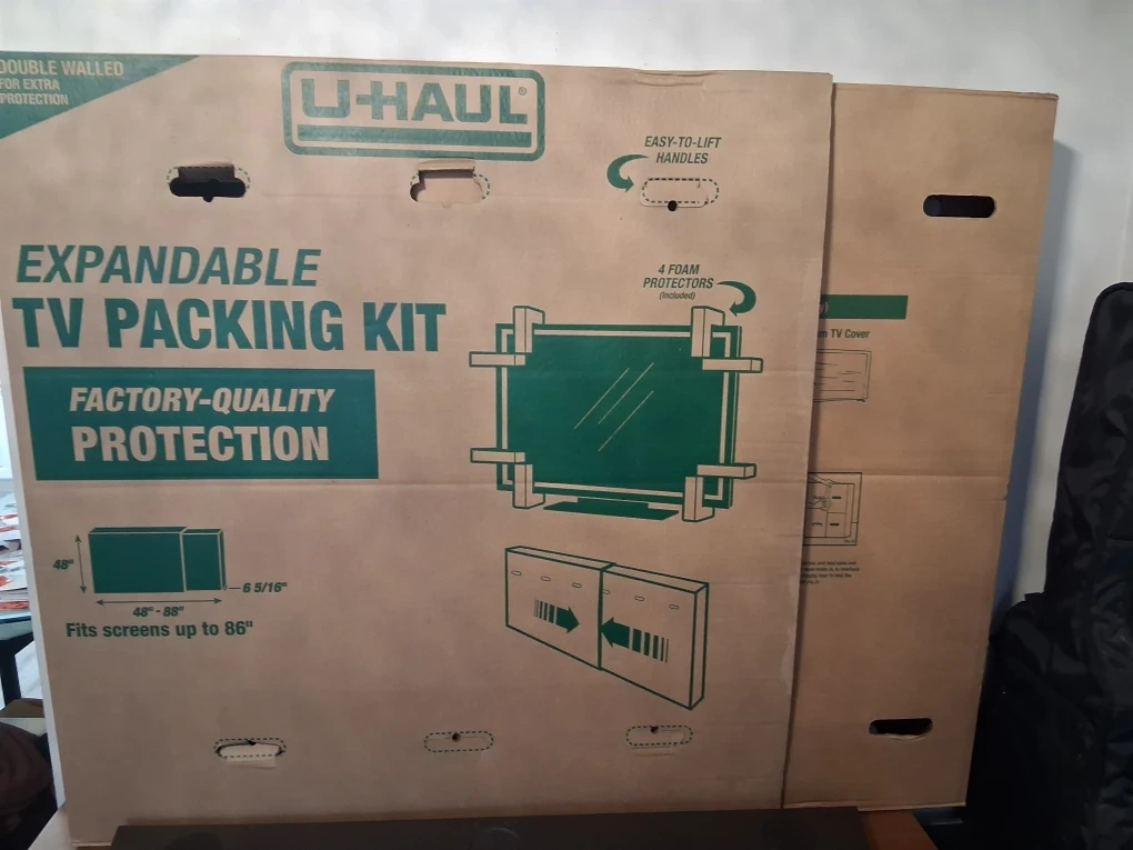 Selling a U-Haul Expandable TV Packing Kit! This kit is designed for screens up to 86 inches and includes 4 foam protectors. It's double-walled for extra protection and has easy-to-lift handles. Dimensions are 48"-88" x 6 5/16".