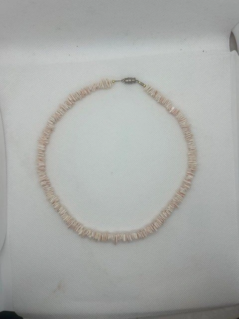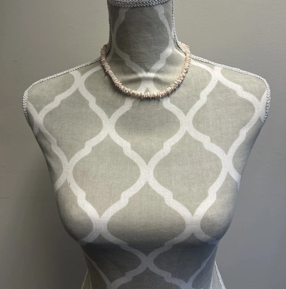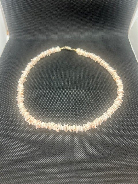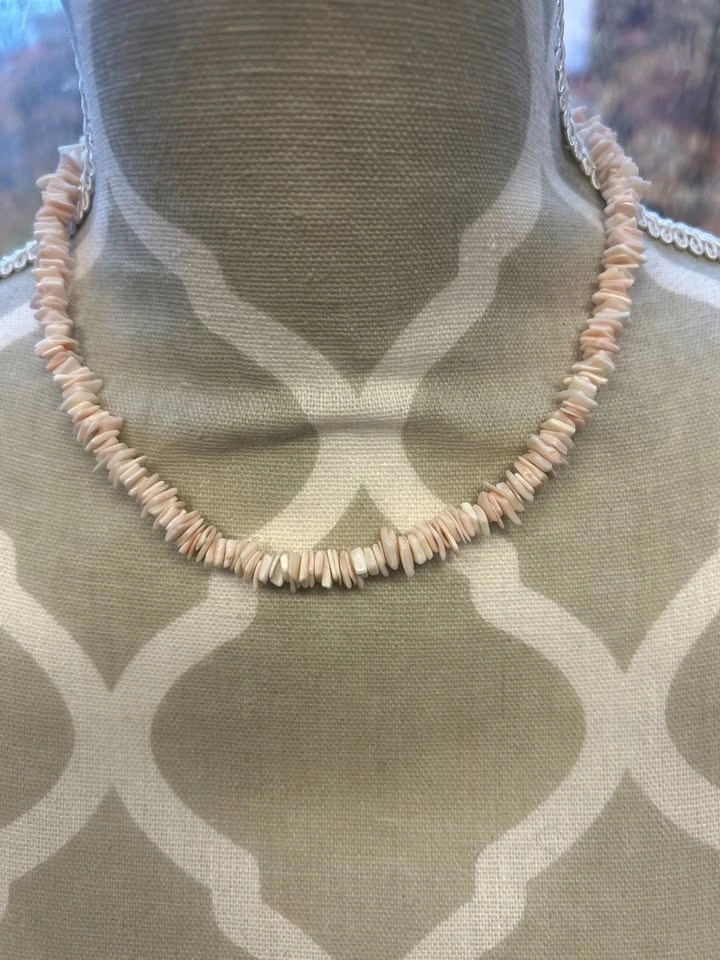 Add a touch of coastal charm to your look with this vintage shell chip necklace. Featuring natural shell pieces in soft shades of cream and pale pink, this classic design is perfect for beach lovers and bohemian style enthusiasts.