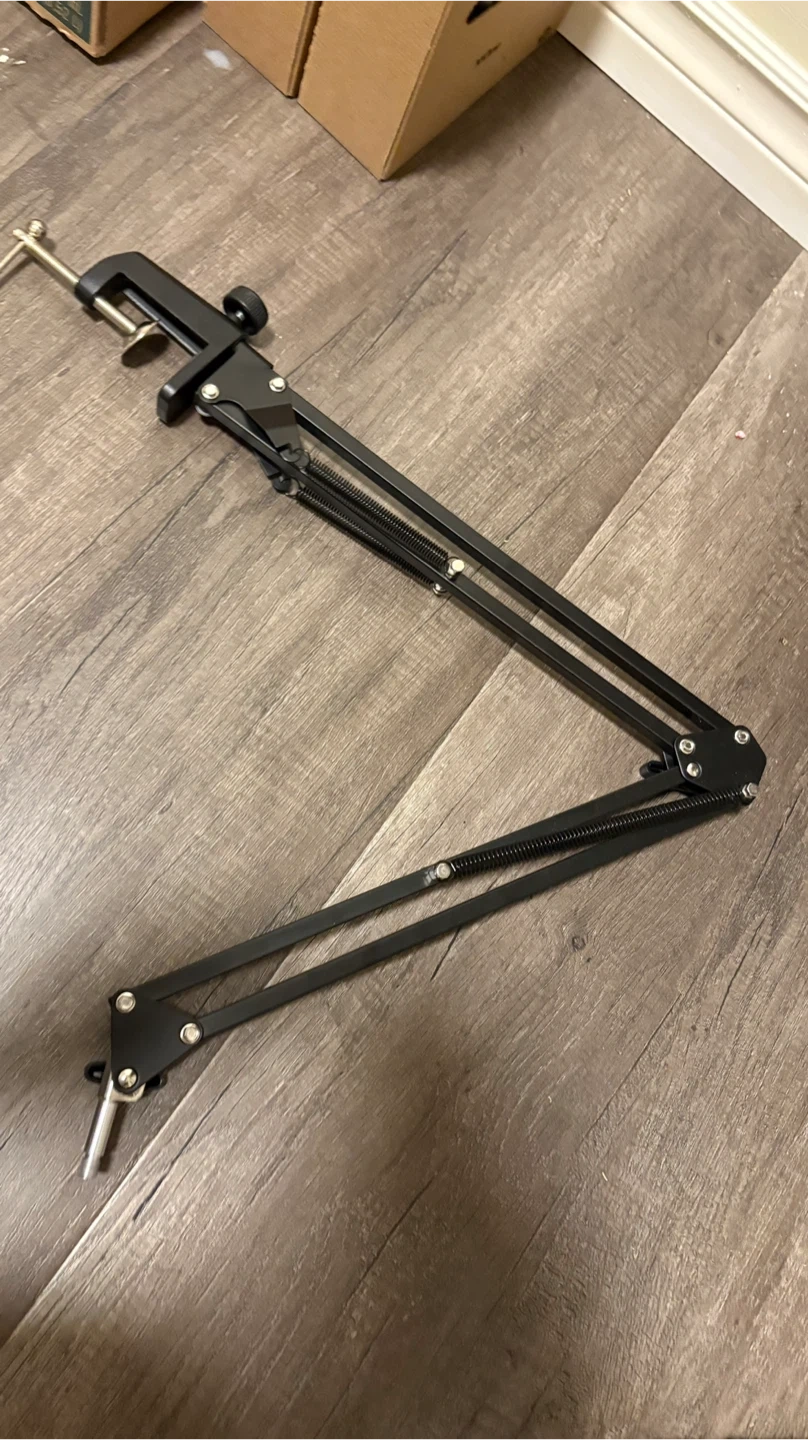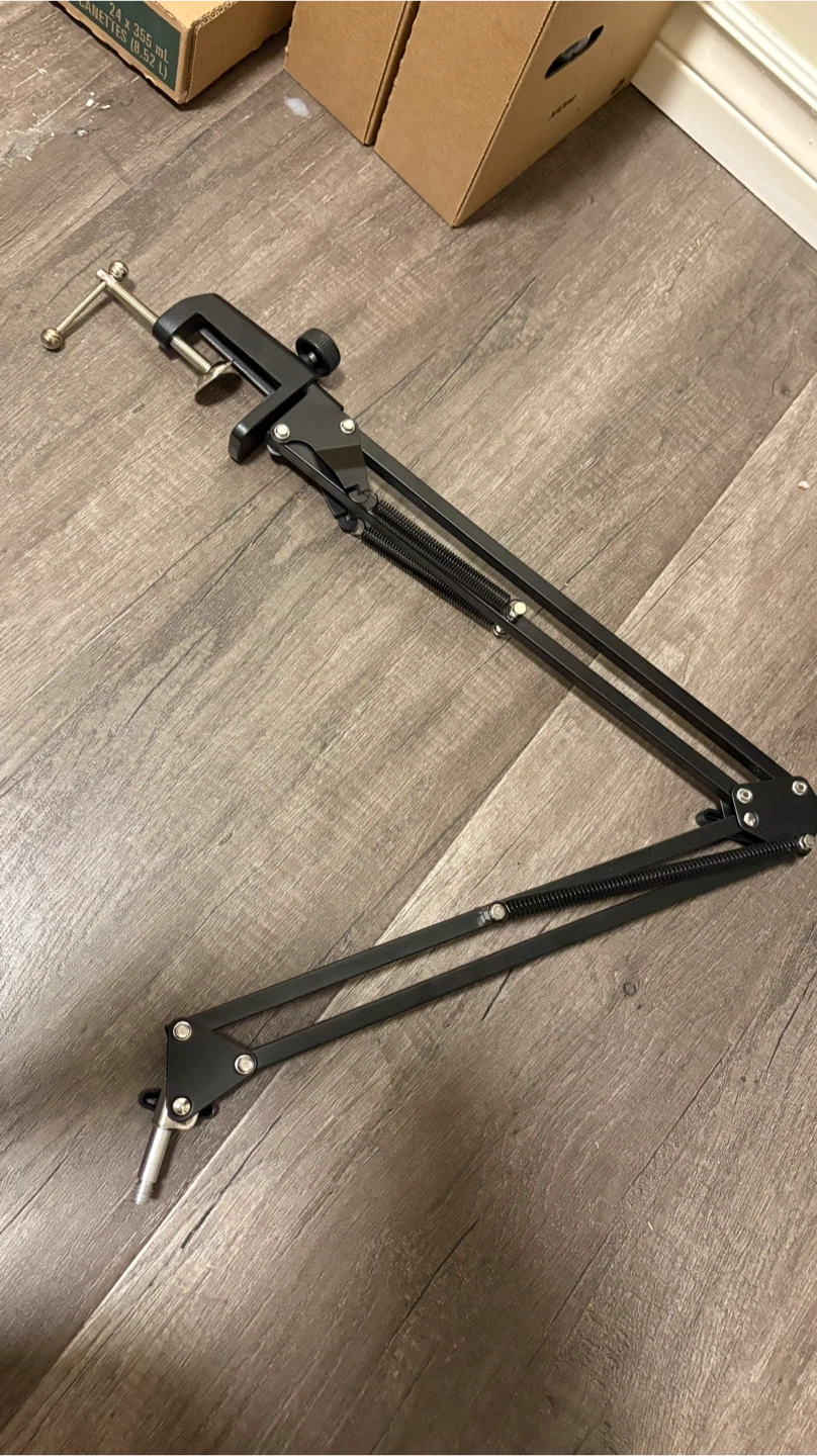 Selling a microphone boom arm stand in great condition! It's perfect for podcasting, streaming, or recording music. The stand is sturdy and adjustable, making it easy to position your microphone exactly where you need it. It's black and has a clamp for easy attachment to a desk or table