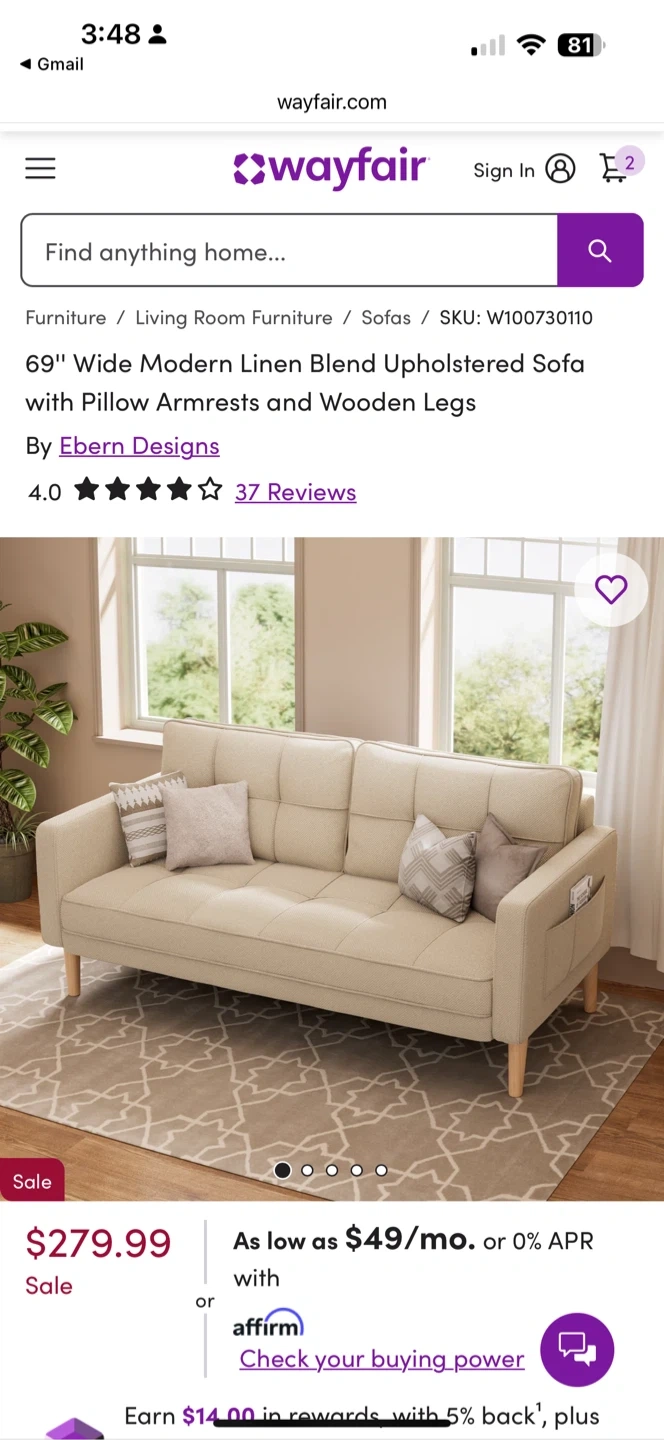 Selling a 69" wide modern linen blend upholstered sofa from Ebern Designs! It features pillow armrests and wooden legs. Originally bought for $279.99