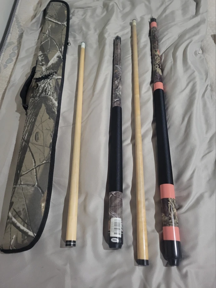 Selling a set of two Viper pool cue sticks. One is green camo, and the other is pink camo. KIDS cue is 16oz weight and comes with a carrying case the ADULTS cue is 20oz. Take both.