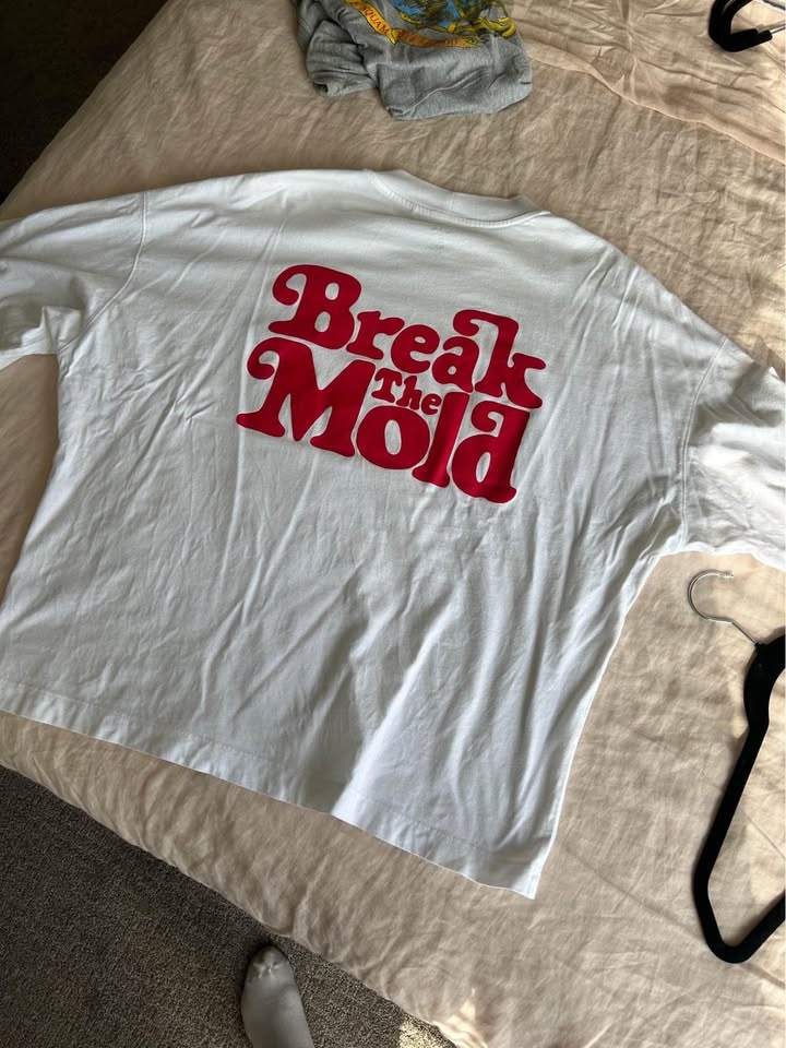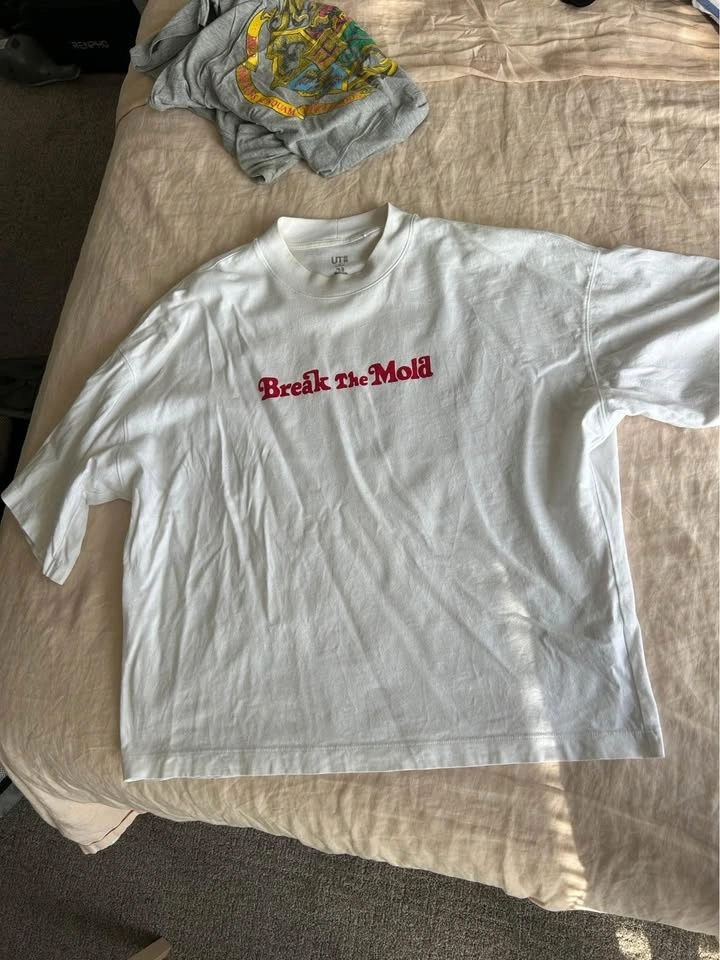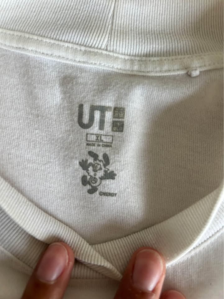 Uniqlo tshirt XL. Thicker fabric, slight discolouration on collar but should come out with oxiclean. It was always hung to dry.