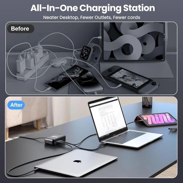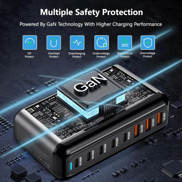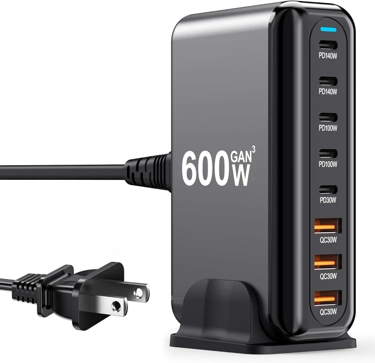 This is a 600W GaN3 total power fast charging station. It has multiple safety protections and is powered by GaN technology with higher charging performance. It has wide compatibility for smartphones, laptops & tablets, and other devices.