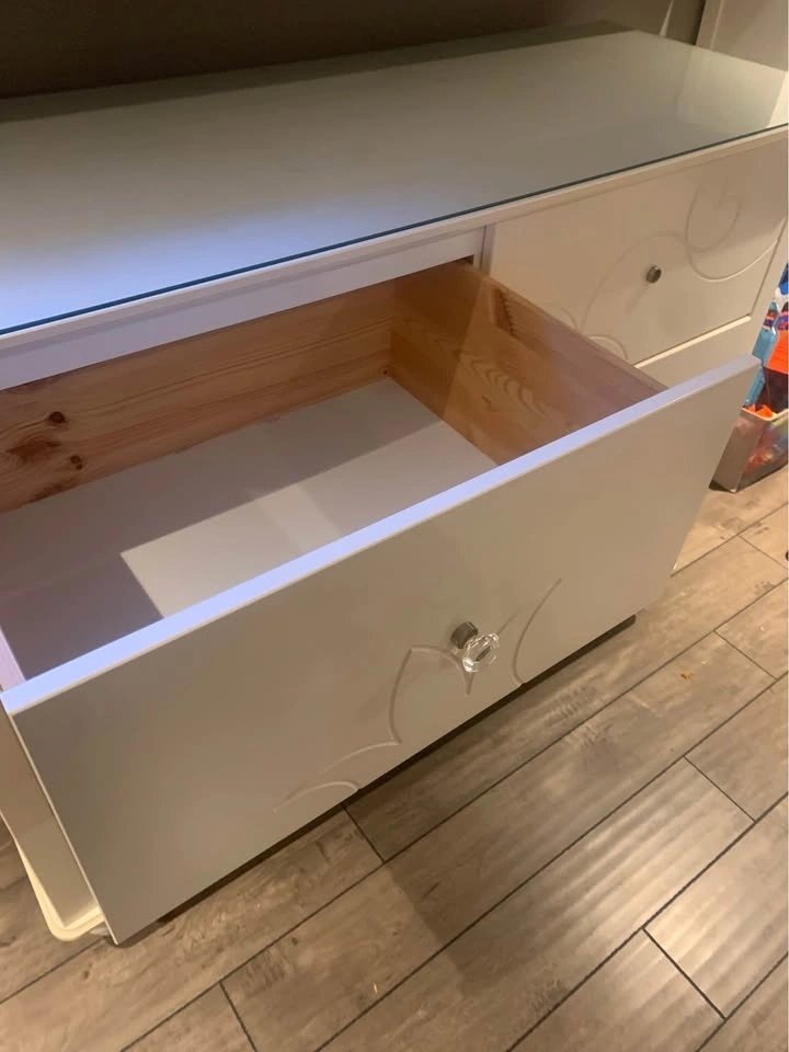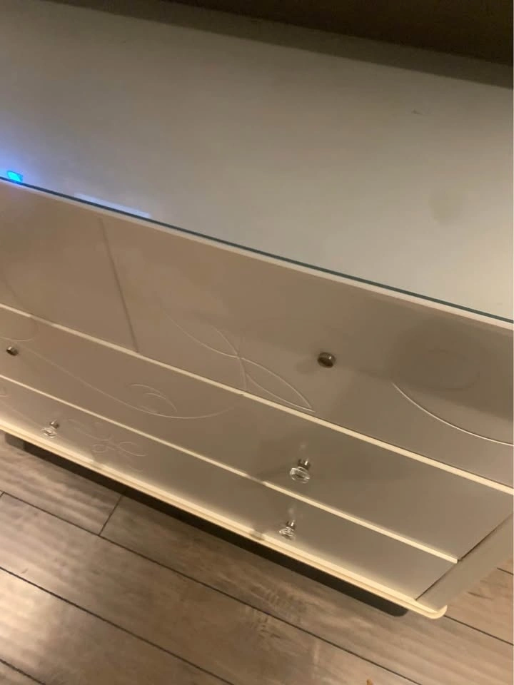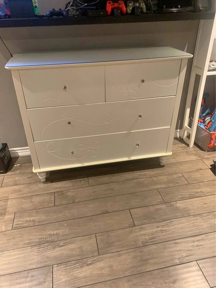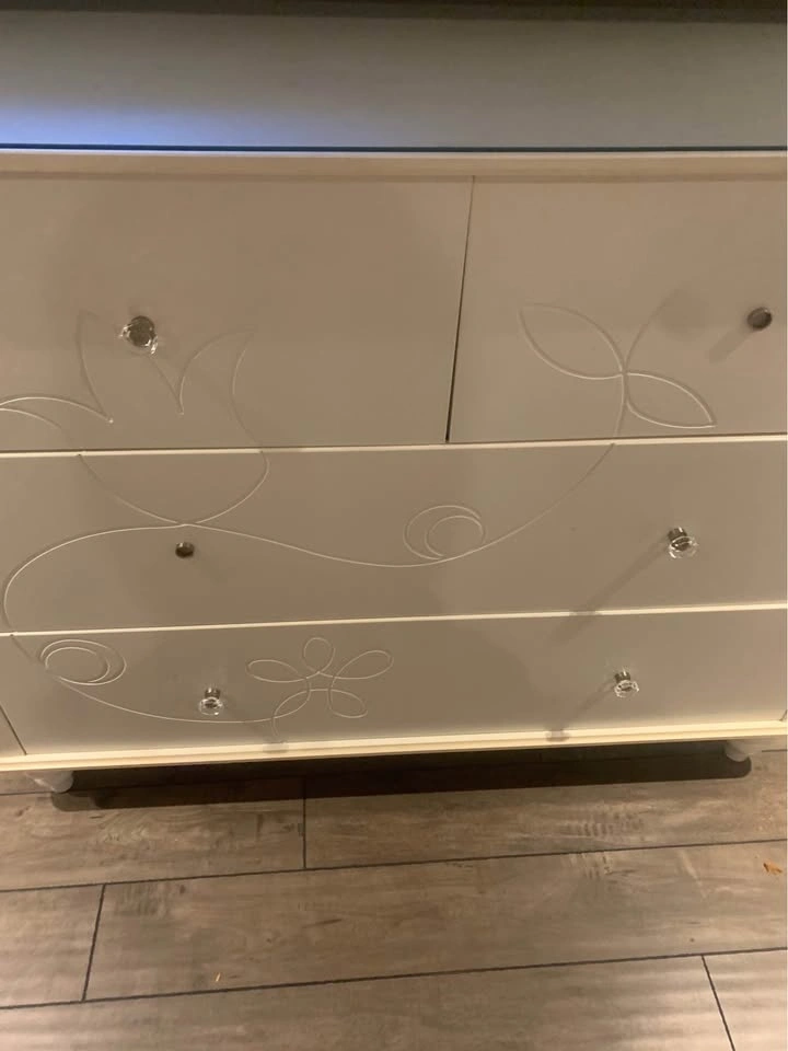 Large heavy duty dresser, think it’s ikea. Has floral design on it and a glass top. Missing 2 pulls, not sure where they're from but can easily be swapped.