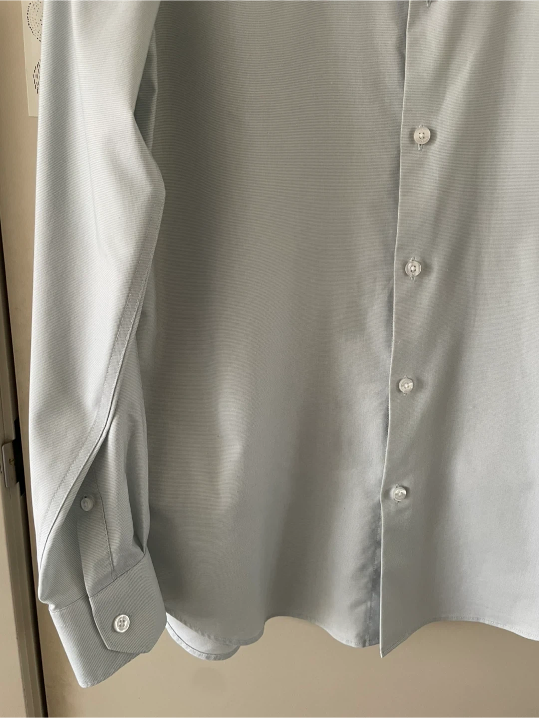 Slim fit through the chest and waist. Spread collar. Long sleeves with buttoned cuffs. Size Medium. In excellent condition.