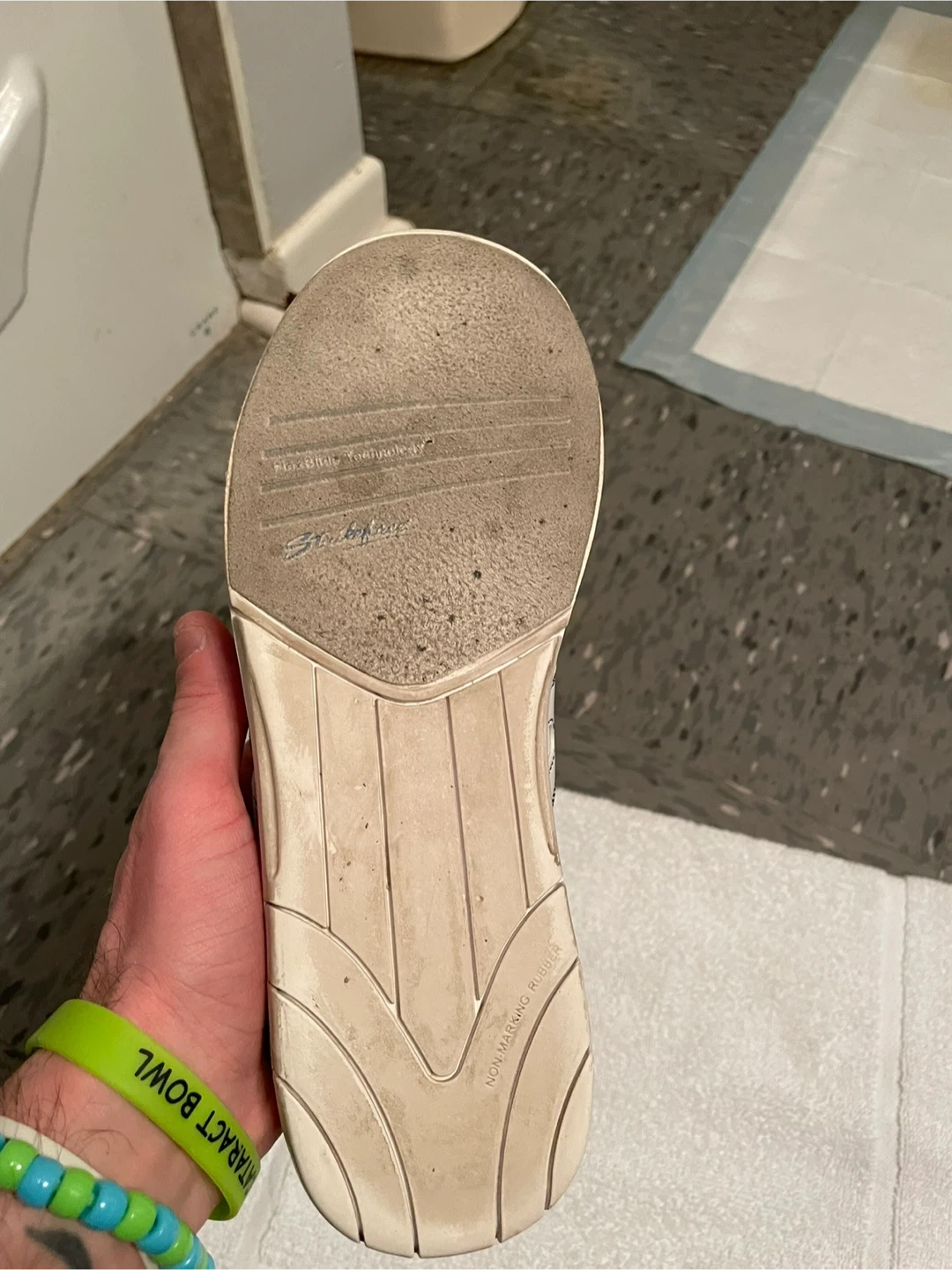 Selling a pair of Dexter bowling shoes in white with blue accents! They're in good condition and ready for the lanes. Perfect for anyone looking to up their bowling game!