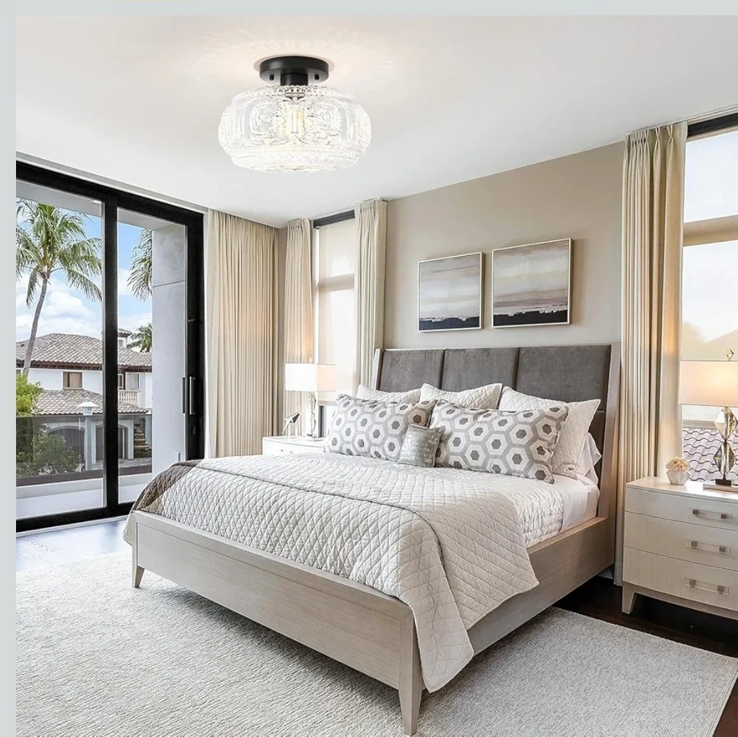 Add a touch of vintage charm to your home with this OYKYOHEI semi-flush mount ceiling light! It features a black base and a decorative glass shade.
