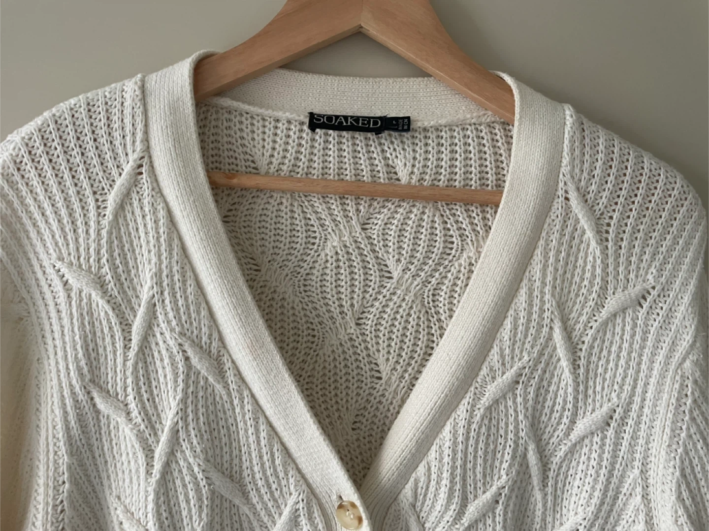 Selling a cozy Soaked cardigan in a lovely cream colour! It features a classic cable knit design and is a size large. Perfect for layering on those cooler days!