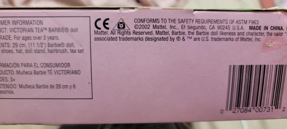 This is a beautiful Victorian Tea Barbie doll, still new in the box! The doll is 29 cm (11 1/2") tall and includes a Barbie doll, shoes, hat, doll stand, hairbrush, and tea set. Recommended for ages 3 and up. It's a perfect addition to any Barbie collection! This is a 2002 barbie
