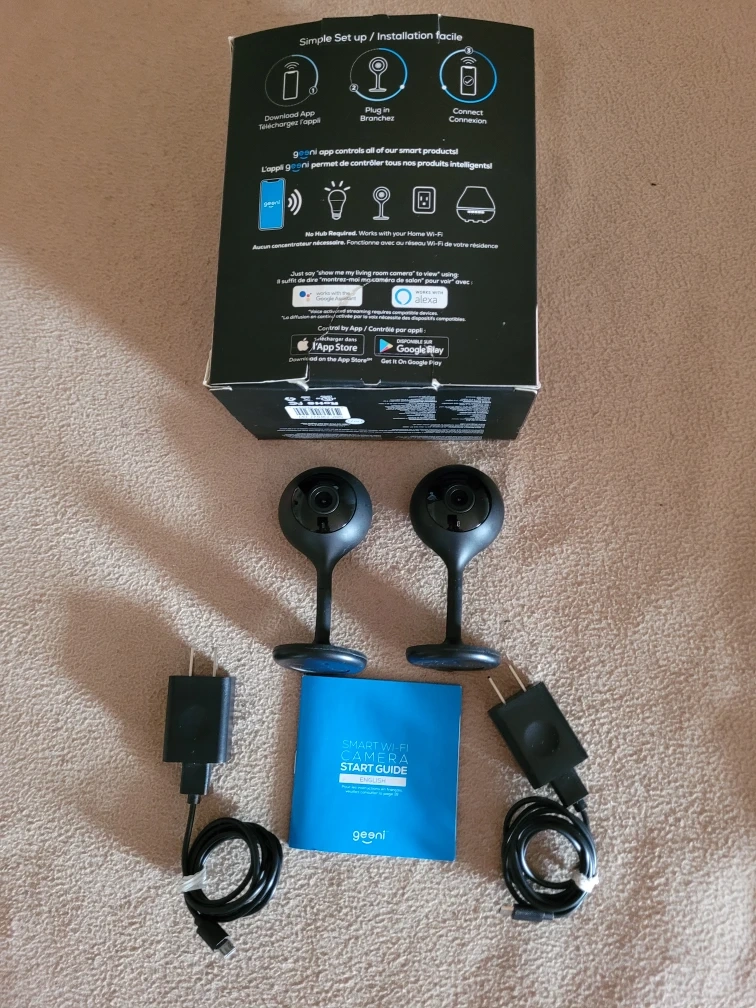 I'm selling a set of Geeni Look HD smart Wi-Fi security cameras. This is a 2-pack, perfect for keeping an eye on your home. These cameras are in excellent condition and come with everything you need to get started.