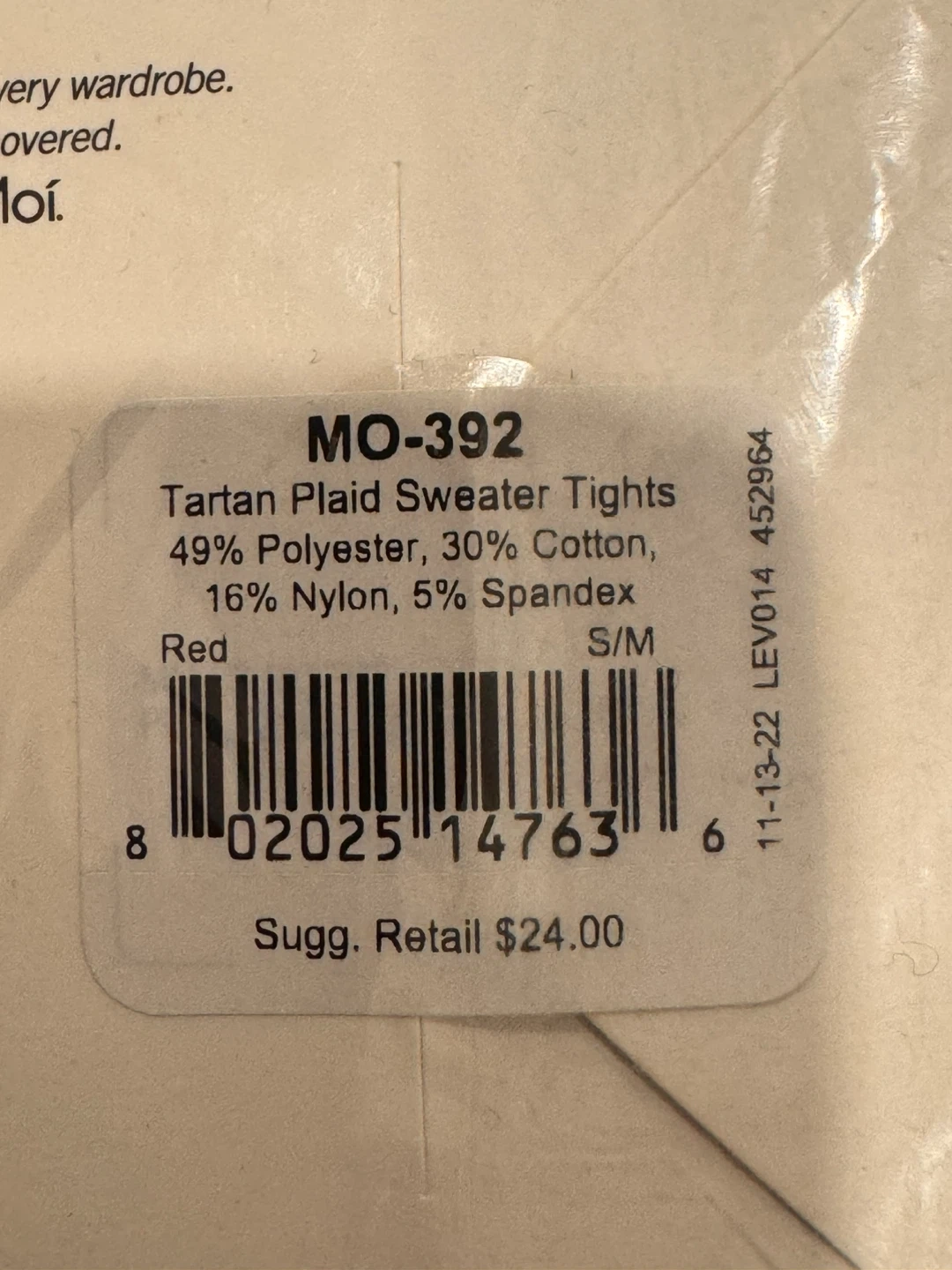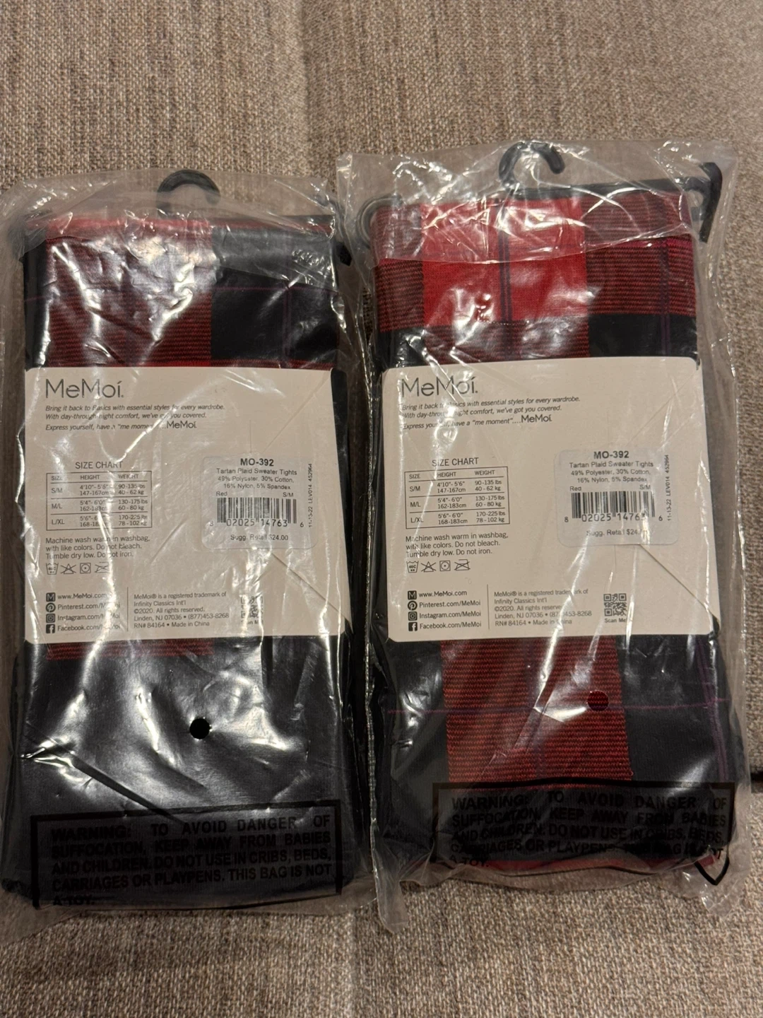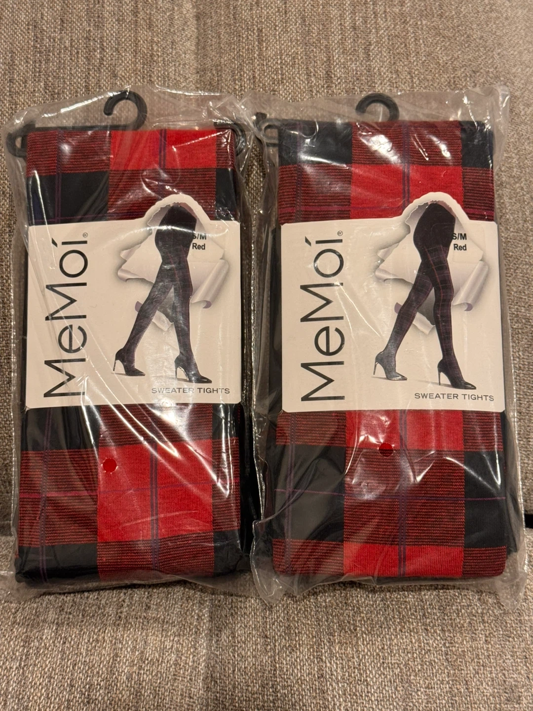 New MeMoi Tartan Plaid Sweater Tights in size S/M. The tights are made of 49% Polyester, 30% Cotton, 16% Nylon, and 5% Spandex. The color is red. The suggested retail price is $24.00. Selling $20 each or best offer.