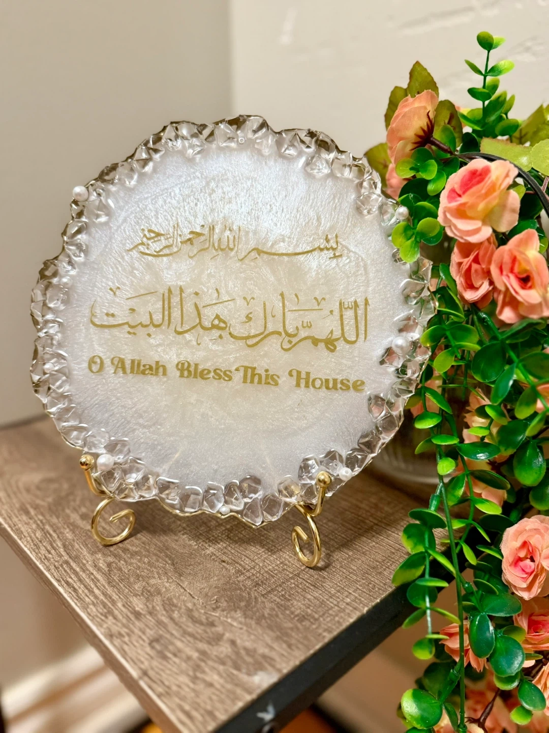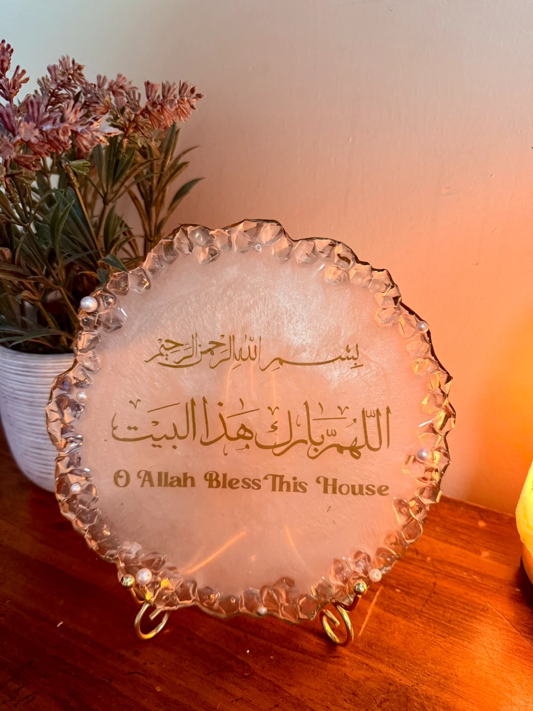 Beautiful handmade resin décor plate with gold Arabic calligraphy and a crystal-style crushed glass border. Comes with a gold metal stand — perfect for home décor, gifts, or entryway display.