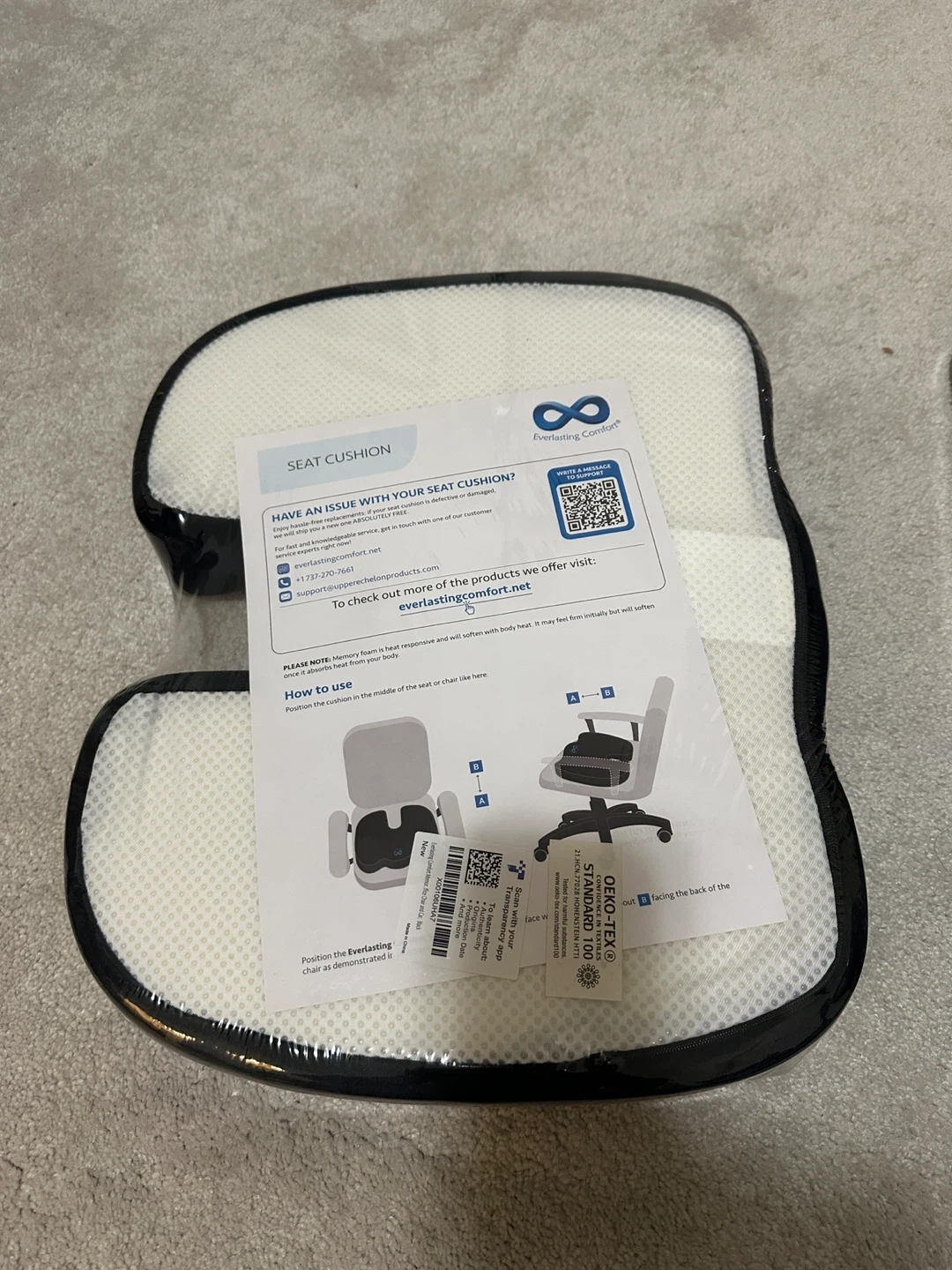 Selling a brand new Everlasting Comfort seat cushion, still in its original packaging! This cushion is designed to provide optimal support and comfort while sitting. It's perfect for use in the office, at home, or even in the car. The cushion features a unique design to help alleviate pressure on your tailbone and promote healthy posture