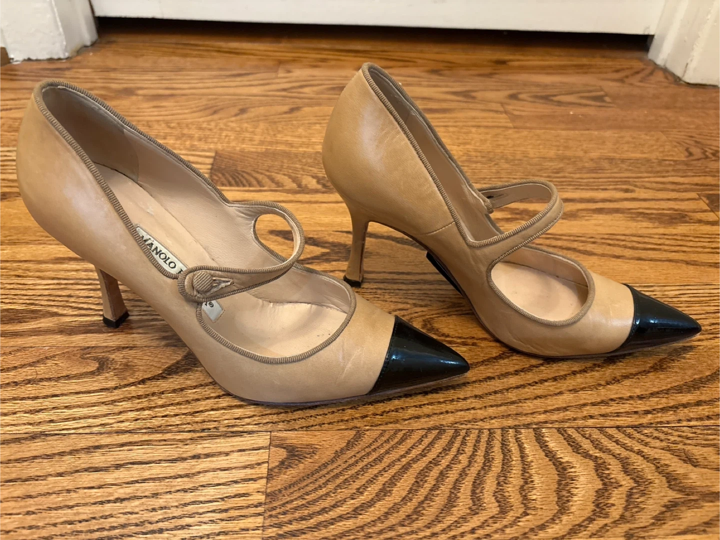 Selling a pair of Manolo Blahnik heels in a lovely beige and black colour. These heels are made of leather and are in great condition. They're perfect for adding a touch of elegance to any outfit!