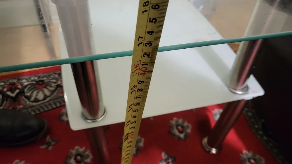 Selling a coffee table with a glass top and white frosted glass underneath. The dimensions are approximately 18 inches in height, 20 inches in width, and 34 inches in length. It has silver metal legs. Great for any living room!